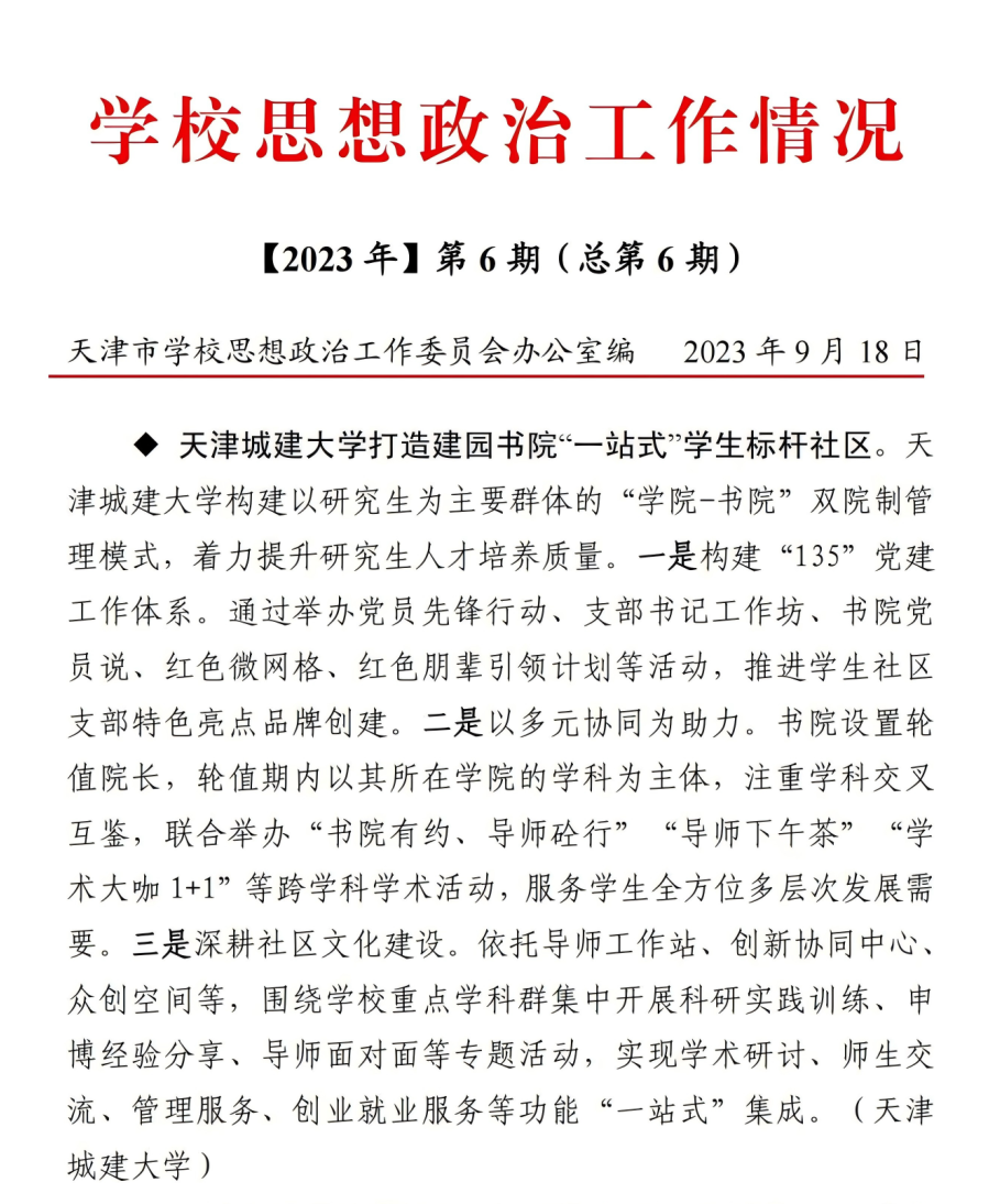 06 2023年9月,学校积极打造建园书院“一站式”学生标杆社区作为典型经验被《学校思政工作情况》收录。