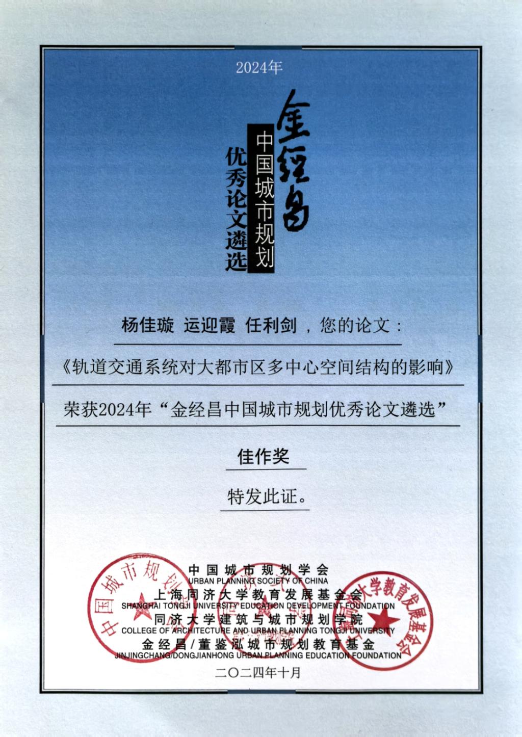 近日,第21届中国城市规划学科发展论坛暨2024UP(Unites Planning)学科发展前沿、2024年“金经昌中国城市规划优秀论文奖”颁奖在同济大学成功举行。2024年“金经昌中国城市规划优秀论文遴选”活动由中国城市规划学会和金经昌/董鉴泓城市规划教育基金联合主办,本年度共推选出34篇优秀论文,通过初评和复评,最终确定一等奖1名,二等奖4名,三等奖7名,佳作奖8名,提名奖14名。beat365建筑学院青年教师杨佳璇喜获佳绩,其发表的论文《轨道交通系统对大都市区多中心空间结构的影响》荣获佳作奖。