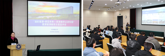 随后,陈敬一行前往现代教育中心与学生代表一起听取天津南站科技商务区发展有限公司副总经理邵婷婷介绍西青区区域概况、经济发展、人文环境等情况,鼓励毕业生把个人理想与天津的发展紧密相连,矢志于在津沽大地追逐梦想、开创未来,助力天津愈发繁荣昌盛。陈敬对学校就业工作及侨联工作给予高度赞许,鞭策广大侨联干部站在新起点,扛牢新使命,打造新局面,为党和国家事业再谱新篇。希望学校侨联持续构建“校政企”联动平台,多措并举推动毕业生高质量充分就业。