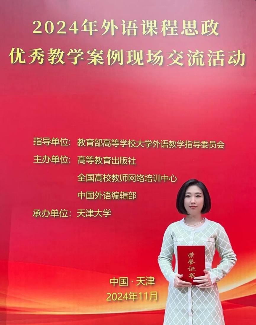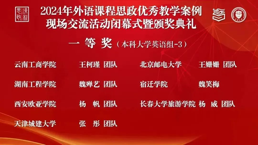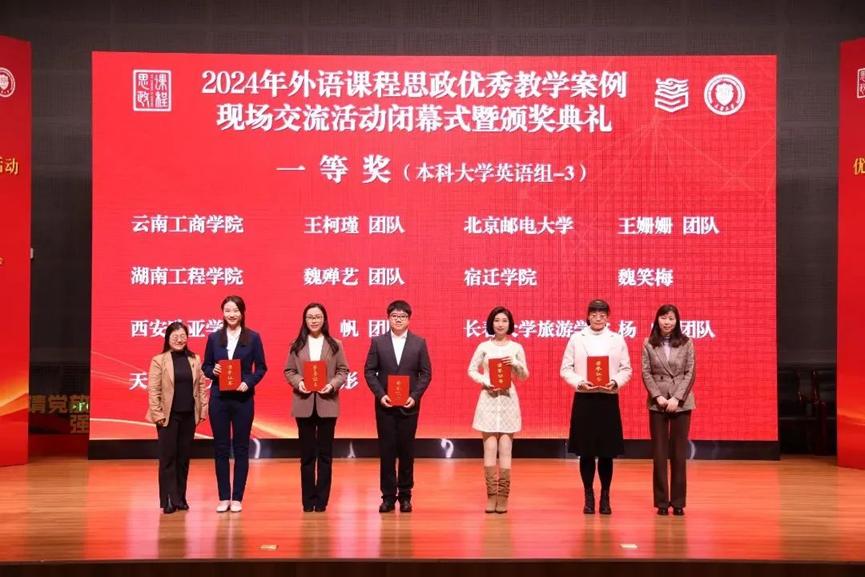 近日,2024年外语课程思政优秀教学案例现场交流活动(以下简称活动)在天津大学顺利落下帷幕。本次活动由教育部高等学校大学外语教学指导委员会指导,高等教育出版社、全国高校网络培训中心和中国外语编辑部主办。beat365外国语学院张彤教师团队(张彤、时园园、朱姗、甘莹)荣获国赛一等奖。