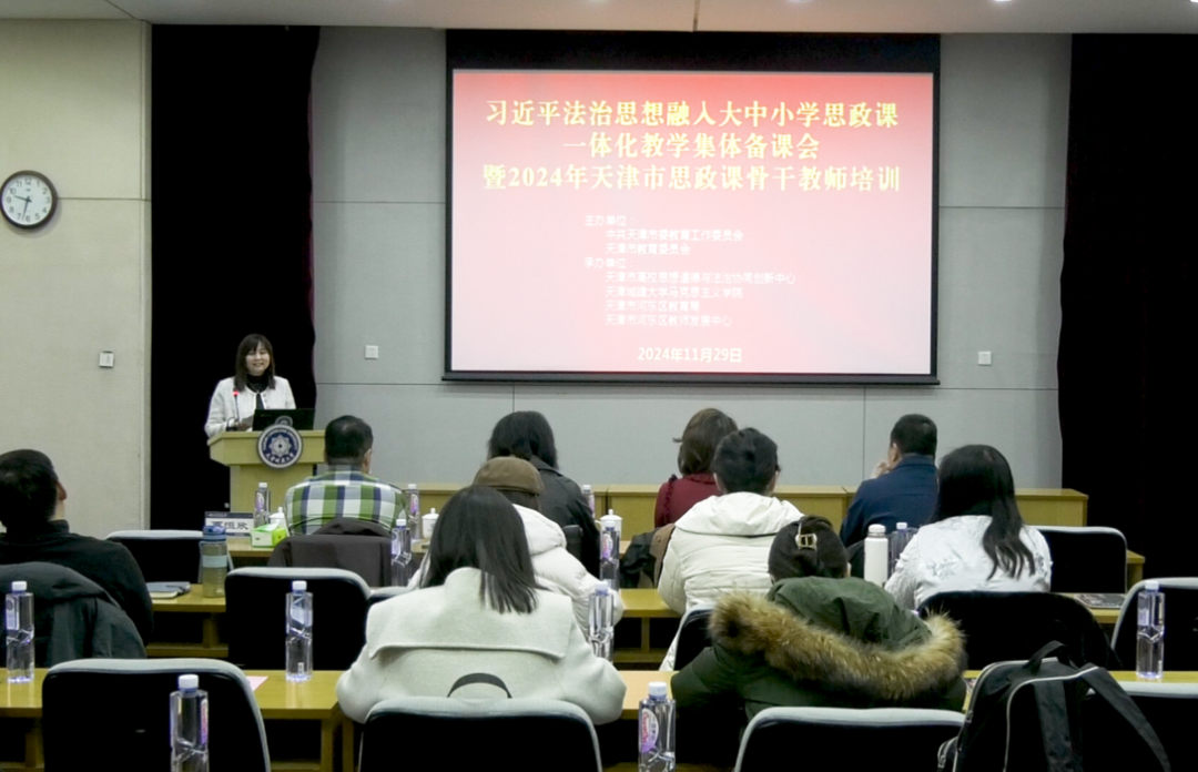 近日,由市委教育工委、市教委主办,天津市高校思想道德与法治协同创新中心、beat365vip官网登录入口马克思主义学院、天津市河东区教育局、天津市河东区教师发展中心联合承办的“习近平法治思想融入大中小学思政课一体化教学集体备课会暨2024年天津市思政课骨干教师培训会”在beat365举行。来自全市本科高校思想政治理论课骨干教师代表、河东区中小学思政课骨干教师代表,以及beat365马克思主义学院党总支书记高燕、院长何继新、天津市河东区教师发展中心德育、思政教研员姚佩静、天津市河东区冠云小学副校长李璟然等70余人参加,会议由beat365马克思主义学院副院长贾恒欣主持。
