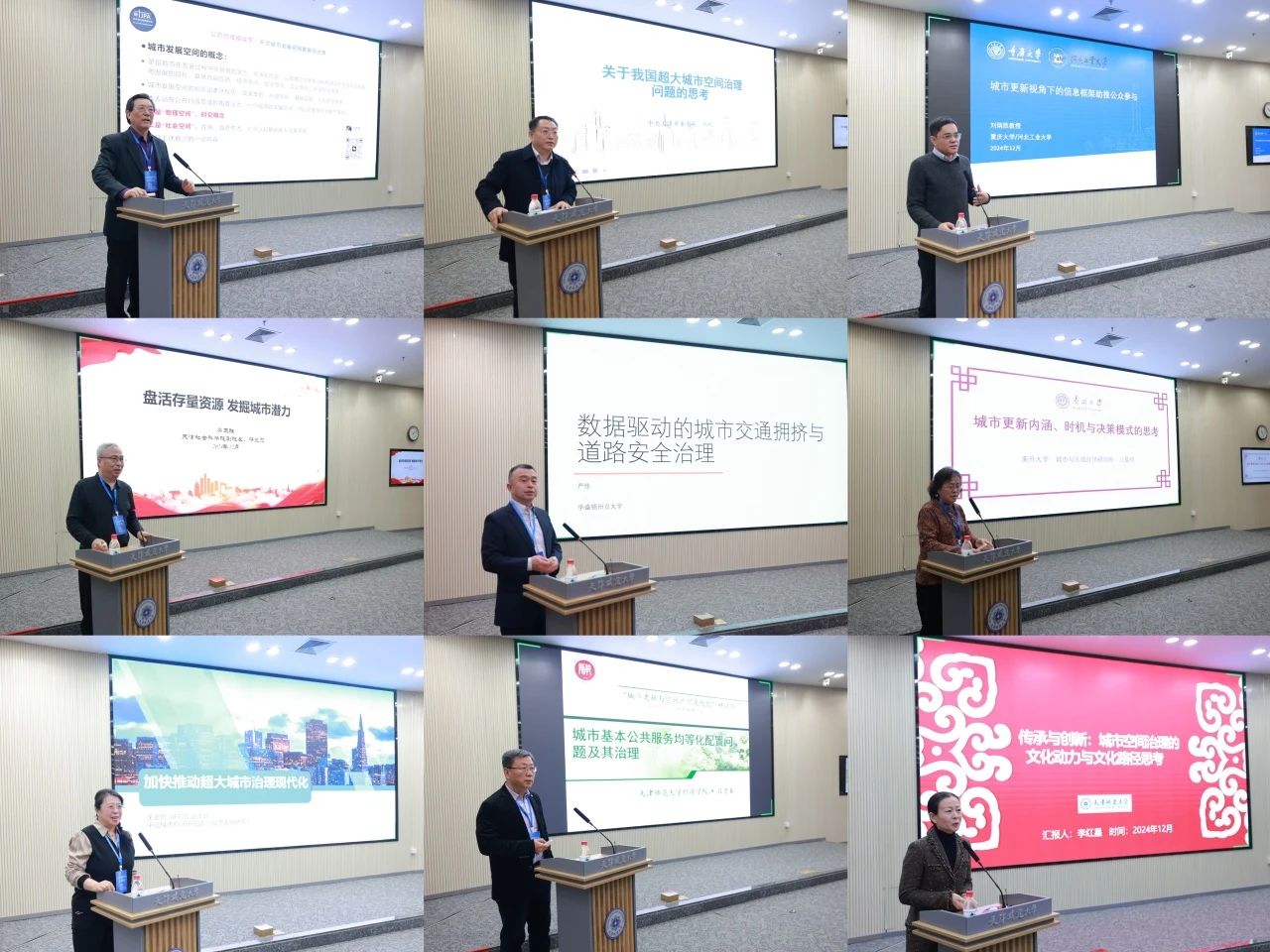 天津市行政管理学会学术顾问委员会主任委员张霁星以《公共行政视域下天津城市发展空间更新与治理》为题,分析了天津“十四五”物理空间布局的特点,探讨了政策与人文社会空间的关系。中共天津市委党校副校长丛屹教授以《数智赋能,加快推进城市治理现代化》为题,阐述了城市空间治理在推进以人为核心的新型城镇化、优化国土空间布局、完善国家治理体系中的重要作用。河北工业大学党委常委、副校长刘炳胜教授以《城市更新视角下的信息框架助推公众参与》为题,探讨了如何通过信息框架设计提升公众参与公共事务的积极性。天津社会科学院党组成员、副院长蔡玉胜研究员在题为《盘活存量资源,挖掘城市潜力》的演讲中,深入剖析了当前存量资源盘活中存在的多个问题,并借鉴了多个城市的成功经验。南开大学英才教授、博士生导师江曼琦教授在《城市更新内涵与决策模式的思考》中,剖析了当前城市更新中存在的政府成本负担重、市场主导居民利益保护弱、多元产权协调难等多个问题。华盛顿州立大学严佳教授在题为《数据驱动的城市交通拥堵与安全治理》的演讲中,探讨了利用大数据和人工智能技术解决交通拥挤与安全问题的创新方法。《城市发展研究》副主编王亚男研究员发表题为《加快推动超大城市治理现代化》的主题演讲,围绕超大城市治理的关键议题与实践,深入阐述了新时代城市治理的重要性和挑战。天津师范大学经济学院院长吕景春教授发表了题为《城市基本公共服务均等化配置问题及其治理》的演讲,通过三个案例,展示了城市基本公共服务供给不平衡的现状,并指出城乡之间的差距问题。beat365vip官网登录入口经济与管理学院李红星教授发表题为《传承与创新——城市空间治理的文化动力与文化路径思考》的主题演讲,探讨了文化与空间治理之间的深刻联系。