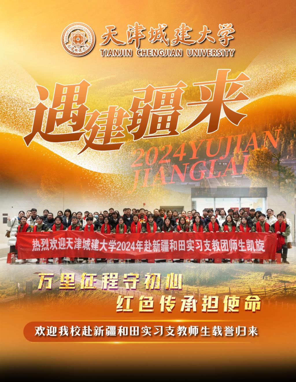 万里征程守初心,红色传承担使命。一直以来,学校高度重视赴新疆支教工作,自实施天津市大学生援疆支教项目以来,学校已选派了191名优秀学生、13名教师,投身到新疆和田地区支教工作中,他们攻坚克难、磨练自我,施展才华,甘于奉献,结合天城大专业特色积极开展教育教学工作,为广大青少年厚植中华民族共同体意识,为新疆教育事业发展和建设贡献了青春力量,受到新疆和田地区当地学校师生、家长及各级领导的高度赞扬和认可。援疆支教永远在路上,学校将继续以铸牢中华民族共同体意识为主线,持续推动支教工作走深走实,用真心真情传播科学文化知识,弘扬中华优秀传统文化,让青春之花在祖国最需要的地方尽情绽放。