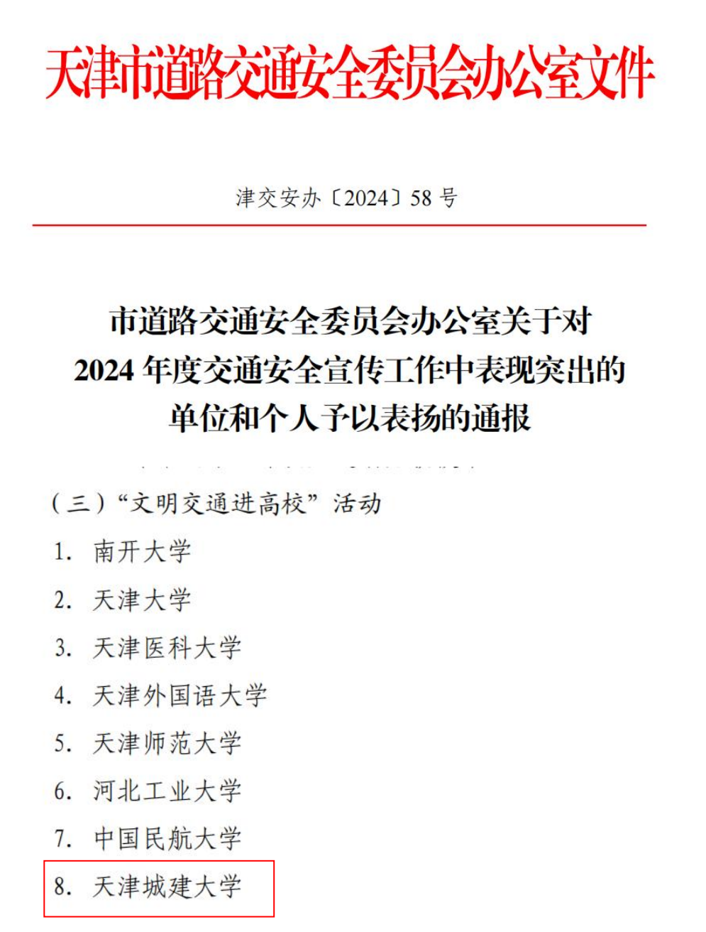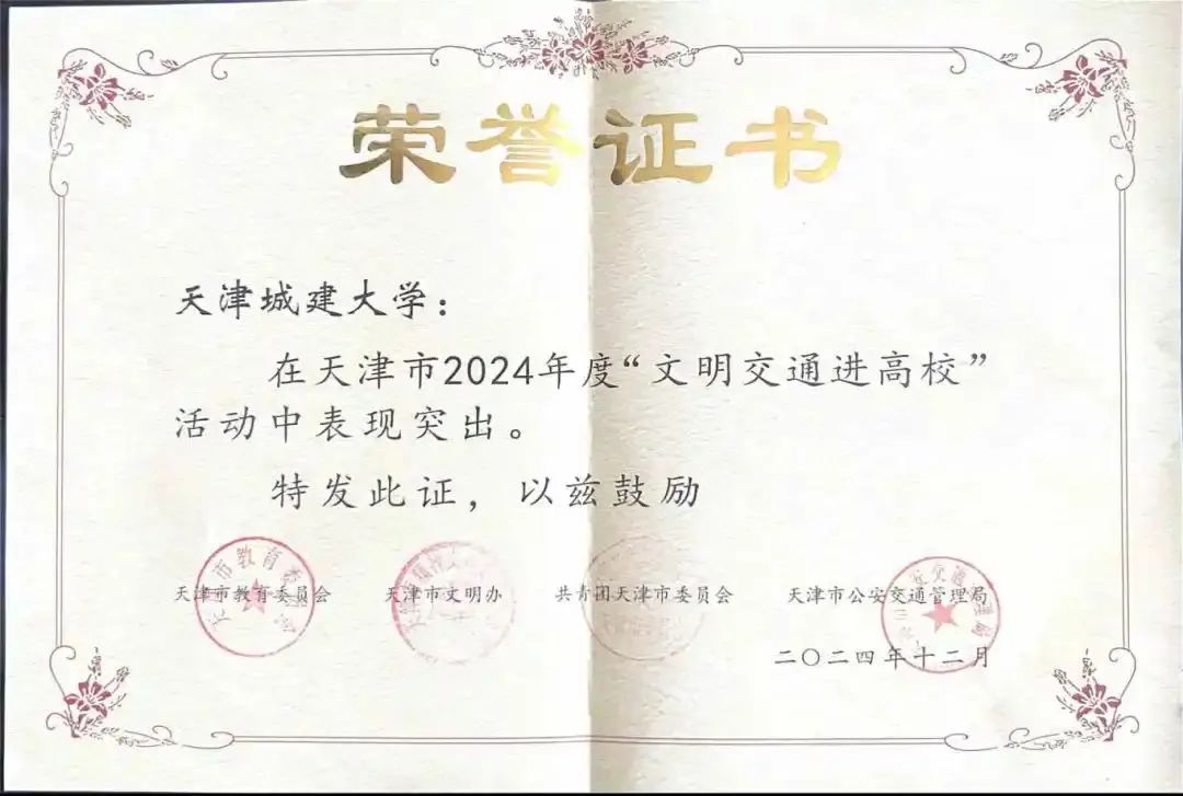 近日,在由天津市教育委员会、天津市文明办、共青团天津市委员会、天津市公安交通管理局等部门组织开展的2024年度“文明交通进高校”活动中,beat365获评“文明交通进高校”活动优秀高校。
