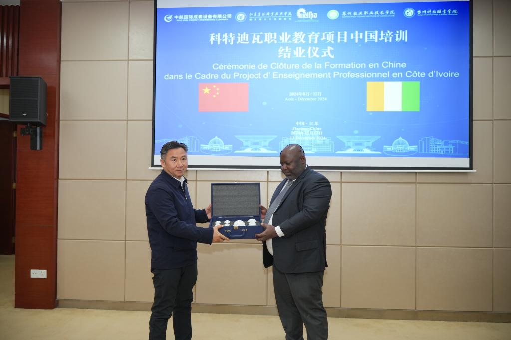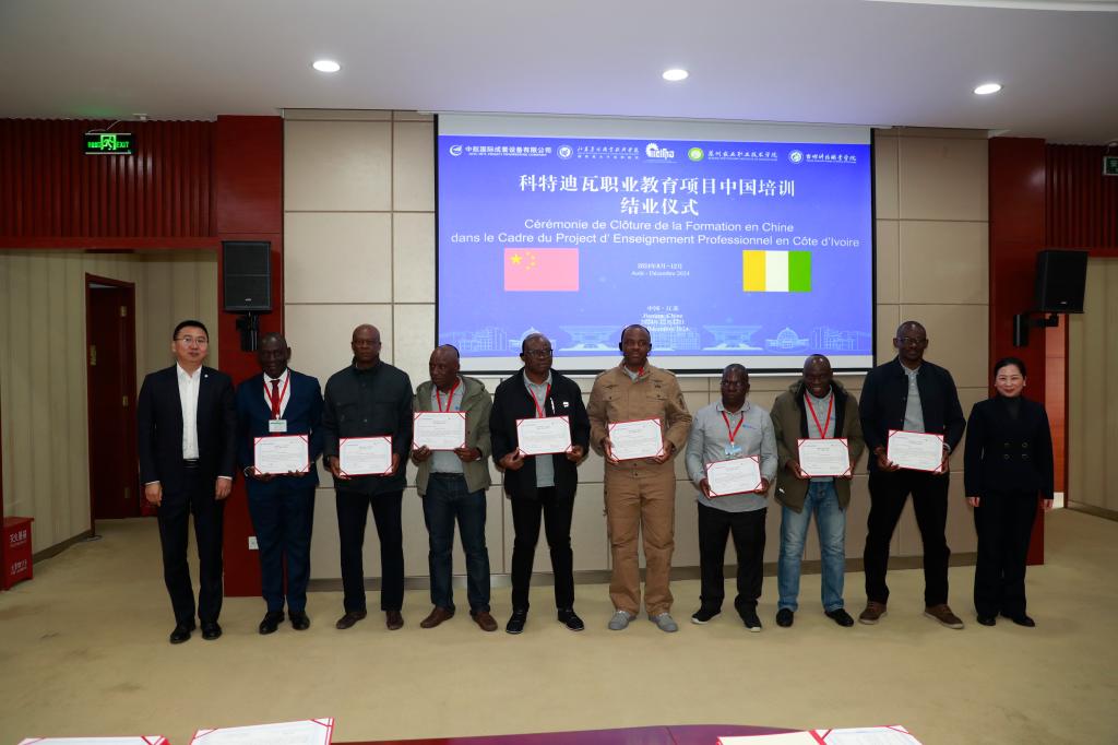 致辞环节后,三所培训项目承办院校领导分别与中航国际成套设备有限公司项目四部总经理赵磊磊为43名学员颁发了结业证书,并分别和来访的科特迪瓦来宾互赠了礼品,科特迪瓦技术教育、职业培训和学徒部等来宾分别为优秀学员颁发荣誉证书。