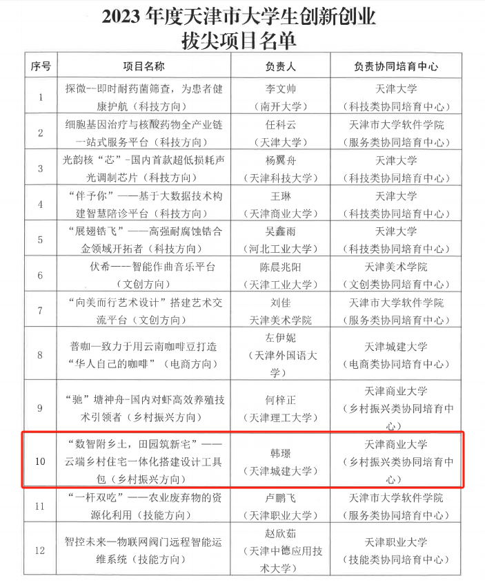 据悉,天津市大学生创新创业拔尖项目由市委教育工委、市教委设立,旨在培养和提高大学生创新、创意、创造、创业的意识和能力,助力各高校涌现出更多优秀的大学生创新创业项目,培育具有天津特色的高质量创新创业成果。