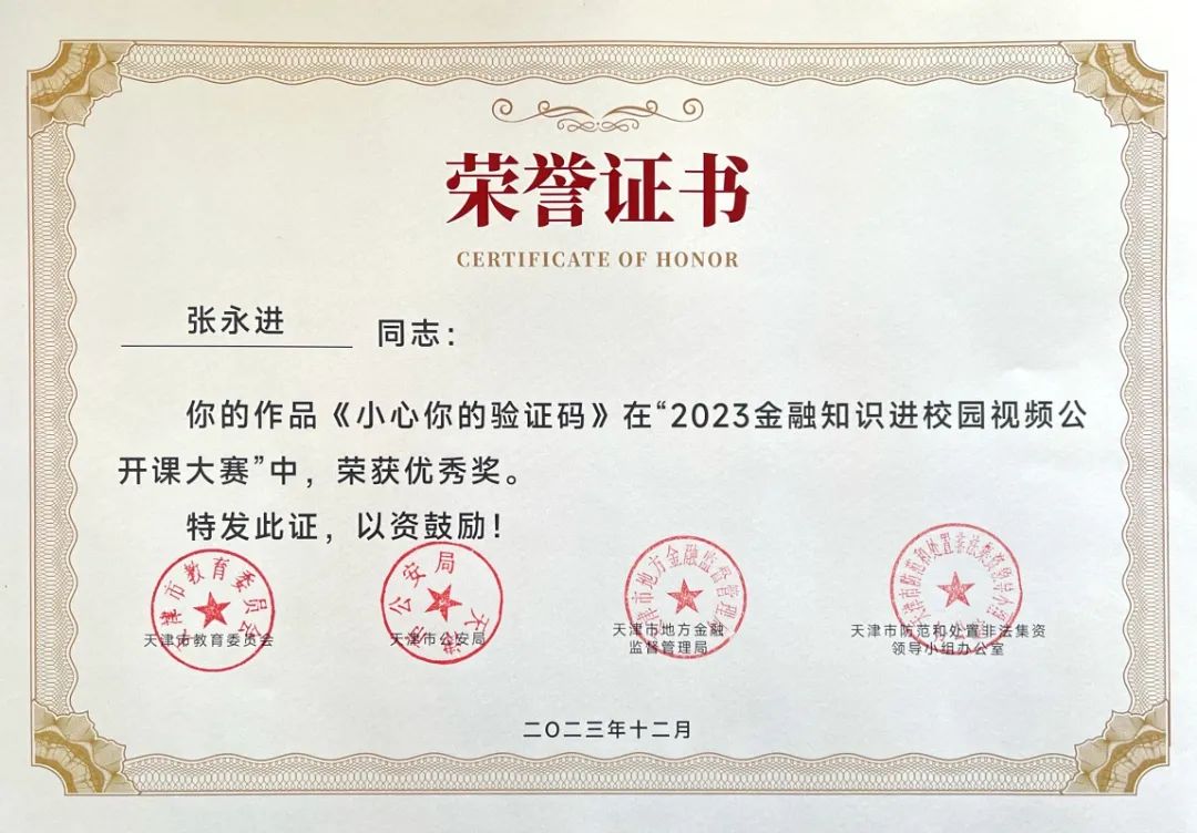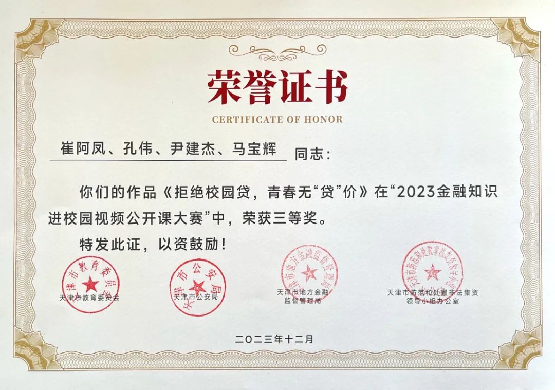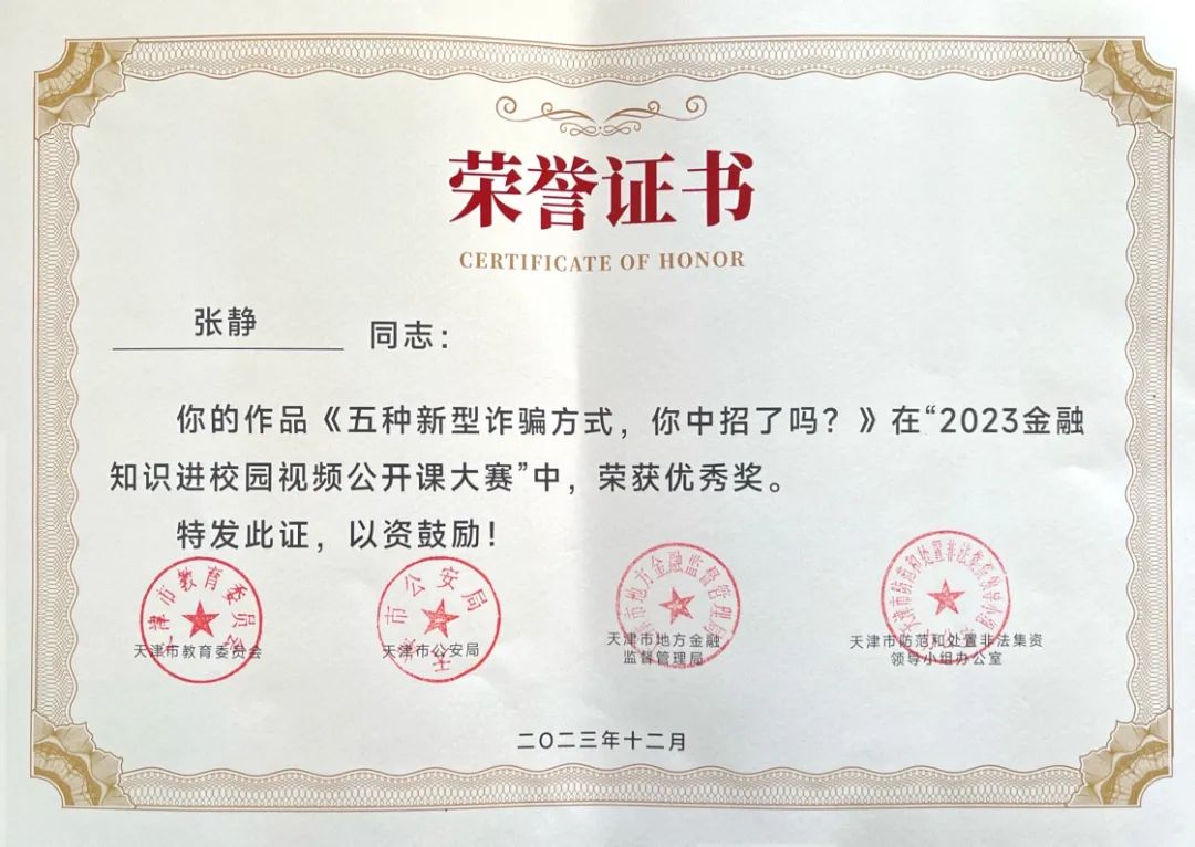 近日,市教育两委公布了2023年天津市教育系统国家安全重点课题调研获奖结果和天津市2023年金融知识进校园视频公开课大赛获奖结果。beat3651项课题,5幅作品纷纷获奖,学校被评为2023年金融知识进校园视频公开课大赛优秀组织单位。