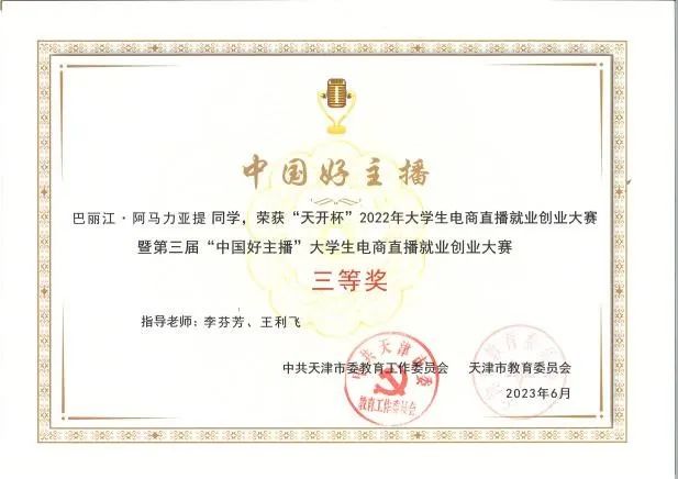 “ 天开杯”天津市大学生电商直播就业创业大赛暨第三届“中国好主播”大学生电商直播就业创业大赛于2022年12月启动。赛事启动后,beat365积极动员学生参赛,全校共有70支团队报名,发布初赛视频作品200余条,其中8支团队入围决赛。决赛通过京东直播平台进行,依据直播团队的销售数据确定比赛最终成绩,beat3653支团队表现优异并获得佳绩。