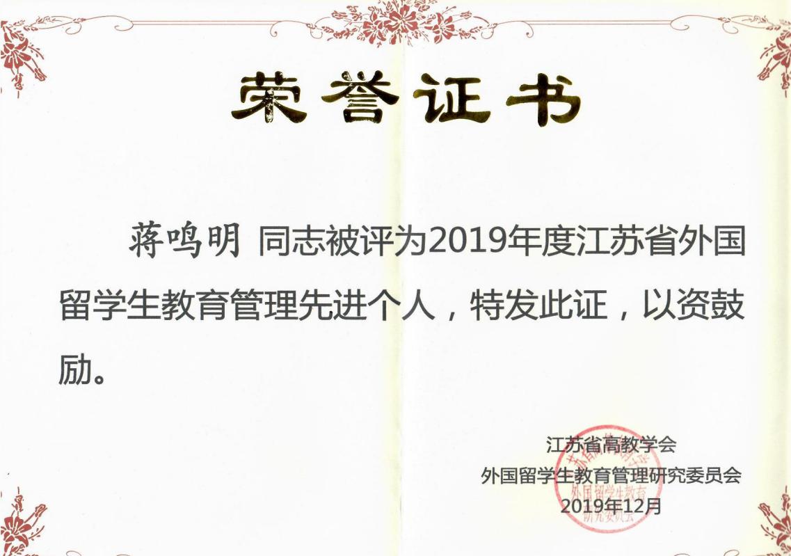 年会还对全省留学生工作年度先进个人进行了表彰,我校蒋鸣明同志荣获“2019年度江苏省外国留学生教育管理先进个人”的称号。