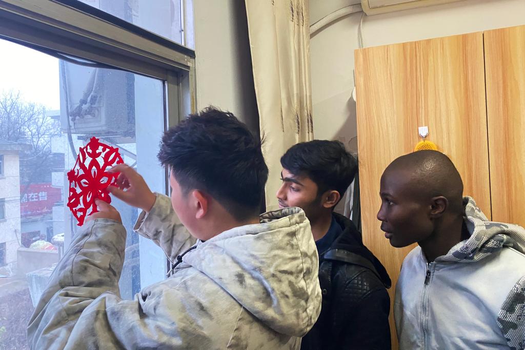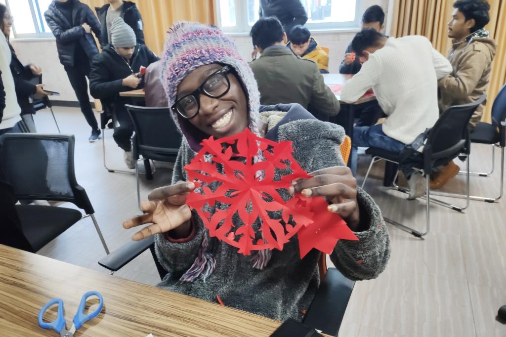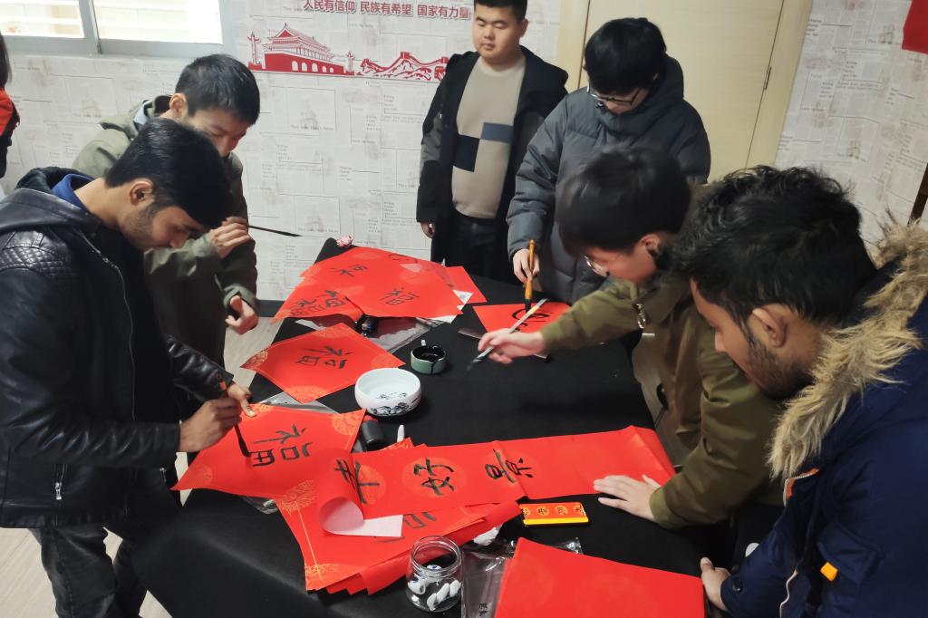 剪纸、写春联、写福字,留学生以自己对中国传统文化的喜爱与理解,完成了一幅幅精美的作品。活动现场,大家还一起观看了我校元旦晚会回播,让没能到现场的留学生也感受了晚会的热烈与精彩。中外学生一同去留学生宿舍贴上窗花、福字等,营造了喜庆、温暖的新年氛围。