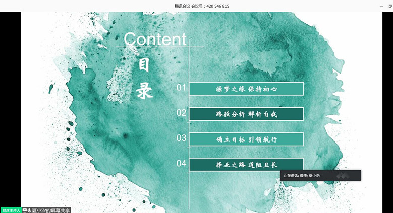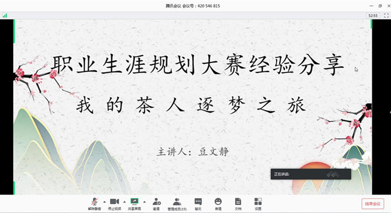 17园林技术班王静从自身比赛出发,通过“源梦之缘保持初心”、“路径分析解析旬我”、“确立目标引领航行”、“择业之路道阻且长”四部分内容,与同学们分享了确定参赛主题、撰写职业生涯规划书、制作PPT和路演讲稿的经验及比赛技巧。茶艺专业毕业生豆文静则从“职业目标的可实施性”、“大赛赛制的综合性”、“和比赛现场的规范性”入手,建议同学们利用好职业生涯规划测评充分认识自我,准确确立职业目标,训练现场表现力,演讲时要语速流畅、自然大方。