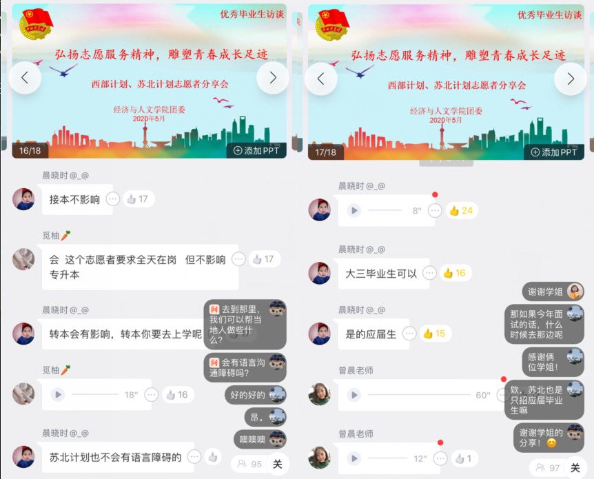 5月6日晚上8点,经济与人文学院团委举办西部计划和苏北计划志愿者线上交流分享会。意向报名2020年西部计划和苏北计划的15名同学和所有的入党积极分子参与了活动。