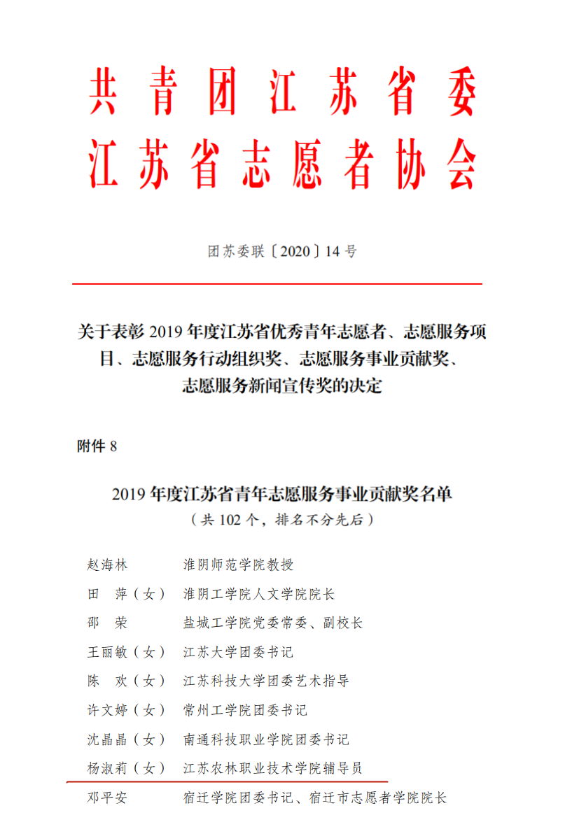 近日,江苏团省委公布2019年度全省青年志愿者行动评选表彰名单,永利官网杨淑莉老师获评“2019年度江苏省青年志愿服务事业贡献奖”。