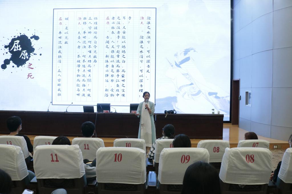 讲座分为家国情怀、诗经与屈原的家国情怀、唐诗与宋词的家国情怀、中国共产党人的家国情怀等4个篇章。讲座中,丁教授先为大家讲述了家国情怀的概论,然后分别通过诗经、唐诗、宋词来讲解中国传统诗词文化中的家国情怀,最后以毛主席“俱往矣,数风流人物,还看今朝”诠释了中华民族长久延续的价值信仰和民族精神。讲座现场掌声雷动。同学们对优秀传统文化和家国情怀的内涵有了新的领悟,纷纷表示争做新时代有为青年,在民族复兴中国梦的征程中绽放青春芳华。