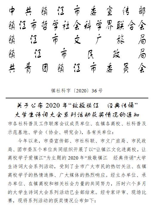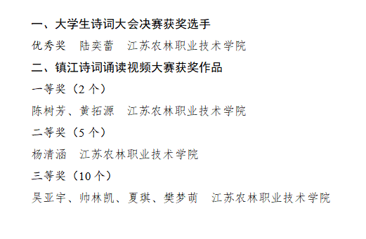 近日,2020年“致敬镇江 经典传诵”大学生诗词大会系列活动获奖情况揭晓。诵读视频比赛中,经济与人文学院陈树芳、黄拓源同学获得一等奖,风景园林学院杨清涵同学获得二等奖,农学园艺学院吴亚宇、帅林凯、夏琪、樊梦萌同学获得三等奖。大学生诗词大会决赛中,农学园艺学院的陆奕蕾同学荣获优秀奖。