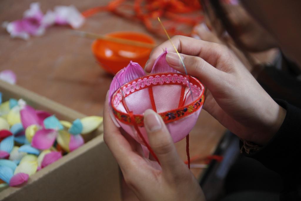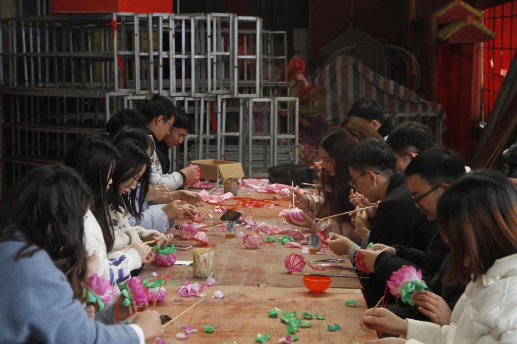 同学们首先跟随传承人陈柏华先生参观了彩灯陈列室,近距离参观了他制作的在国内外获得各项荣誉的花灯,了解了非物质文化遗产句容陈氏秦淮花灯的发展历程。陈柏华先生向同学们讲解了花灯的制作材料、工艺、方法和艺术,同学们在陈先生的指导下开始自己动起手来,用分发的素材制作简单的荷花灯,扎框子、扎花瓣、贴花瓣、做花头,造型精美的荷花灯就制作完成了。同学们体验了亲手制作花灯的乐趣,也感受到了花灯艺人的“匠人精神”。