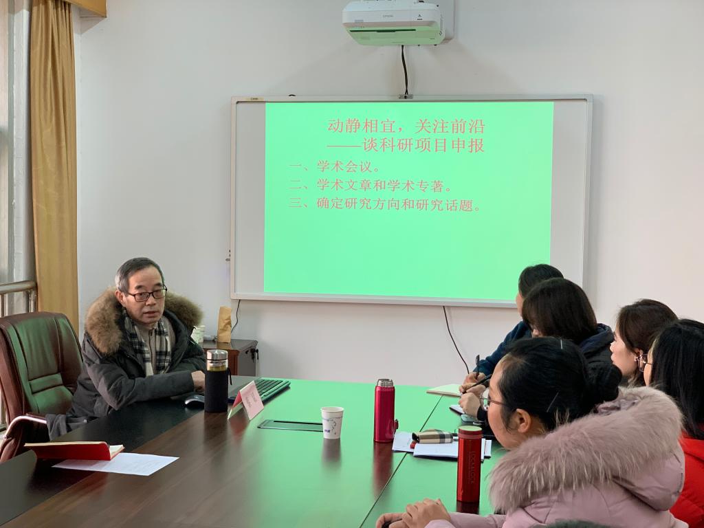1月20日上午,马克思主义学院邀请河海大学外国语学院蔡斌教授来永利官网做科研课题申报专题讲座。全体英语教师参加了此次活动。