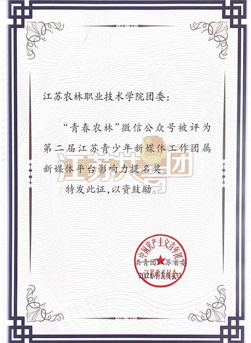 近日,由中共江苏省委网信办指导,共青团江苏省委、江苏青少年新媒体联盟主办的第二届江苏青少年媒体工作优秀项目奖评选结果揭晓,学院团委“青春农林”微信公众号荣获团属新媒体平台影响力提名奖。