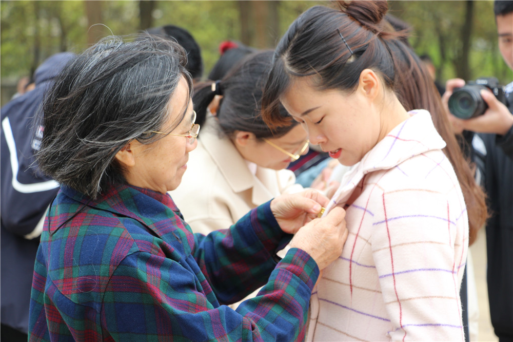 党总支副书记、院长朱孟玲指出,要充分认识开展党史学习教育的重大意义,切实增强思想自觉和行动自觉。在老党员为新党员佩戴党徽环节,入党47年的老党员叶树真亲手为教师新党员孟慧佩戴党徽。叶老师说:“我们老党员要继续发光发热,充分发挥好党史教育‘传帮带’的作用。”新党员们也万分感动与骄傲,一枚小小的徽章蕴含着巨大的能量。他们表示作为一名年轻党员,更要有所作为,要积极主动,增强党员的意识,处处起到表率作用,为党旗增彩,为党徽增光。随后五位同学现场热情洋溢的朗诵——《党在我心中》将气氛推向了高潮。