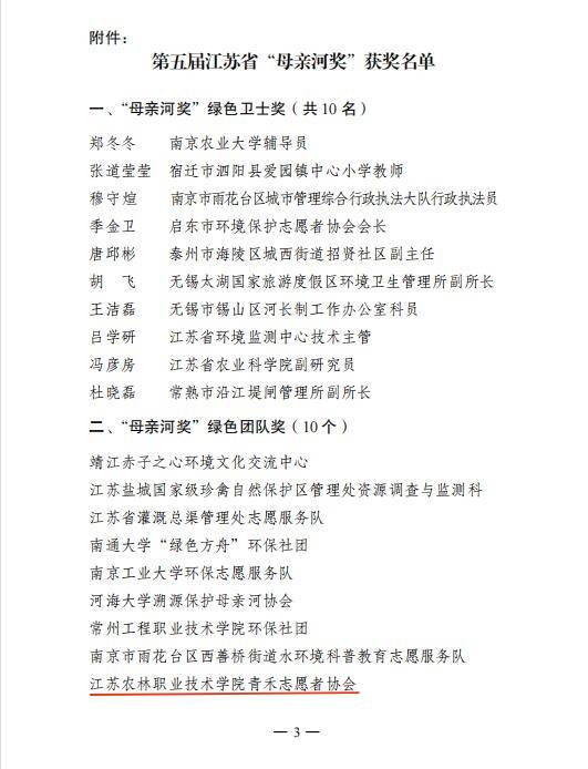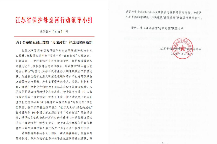 日前,江苏省保护母亲河行动领导小组公布了第五届江苏省“母亲河奖”获奖名单,77779193永利官网青禾志愿者协会获得“保护母亲河”绿色团队奖。