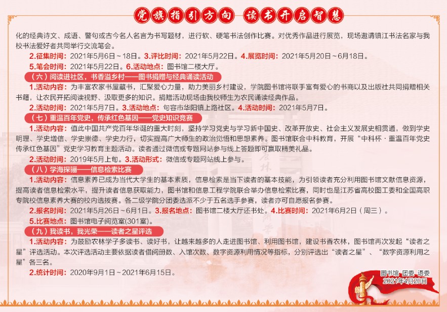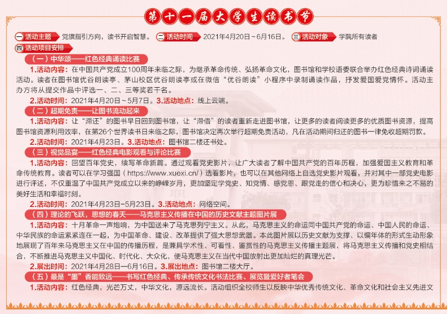 今年是中国共产党成立100周年,是“十四五”规划开局之年,也是全面建设社会主义现代化国家新征程的开启之年。本届大学生读书节活动以“党旗指引方向 读书开启智慧”为主题,紧扣庆祝建党百年的主线,联合学院团委和语委,将开展九项红色主题活动,包括红色经典诵读比赛、红色经典电影观看与评论比赛、马克思主义传播在中国的历史文献主题图片展、党史知识竞赛以及书写红色经典、传承传统文化书法比赛、展览暨爱好者笔会等。