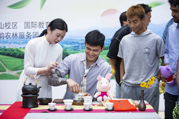 活动现场,茶韵农林服务社团的师生们现场教授前来的同学们六大茶的泡饮技艺。同学们在“悬壶高冲”、“春风拂面”、“凤凰点头”、“赏色闻香”等品茶环节中,零距离感受茶文化,美心修德,陶冶情操,领略中国茶文化的源远流长。现场,师生们一起欣赏了采茶舞、茶诗朗诵、茶字书法、藏族舞蹈等表演,让大家忘记彼此的种族、肤色、语言和习俗,所有的不同,都在茶盏之间和谐共融。