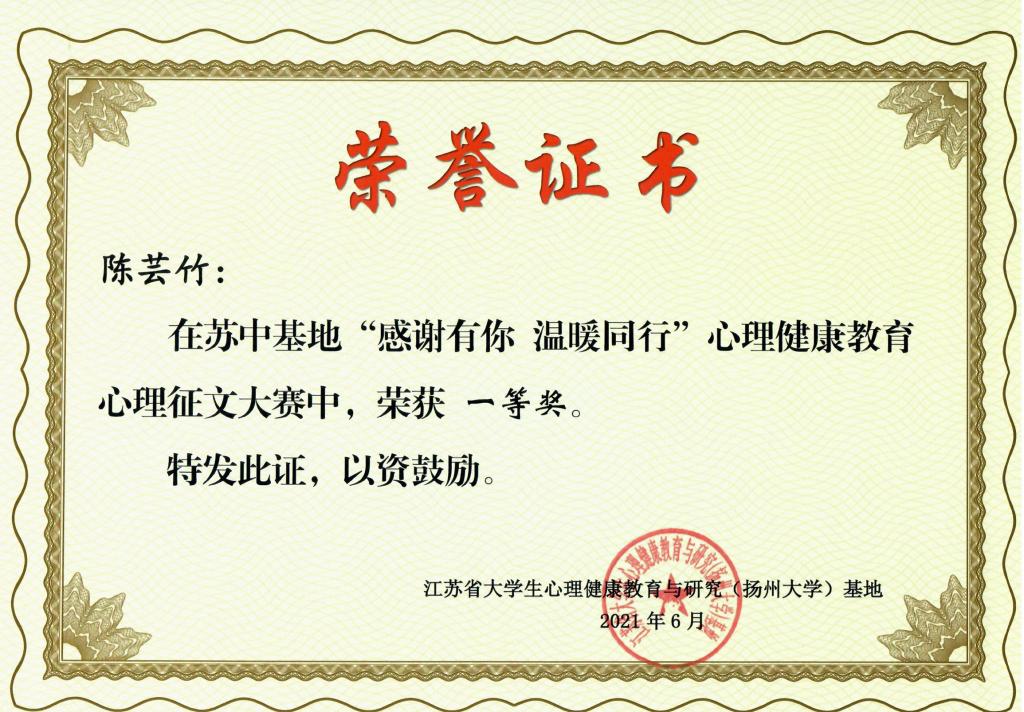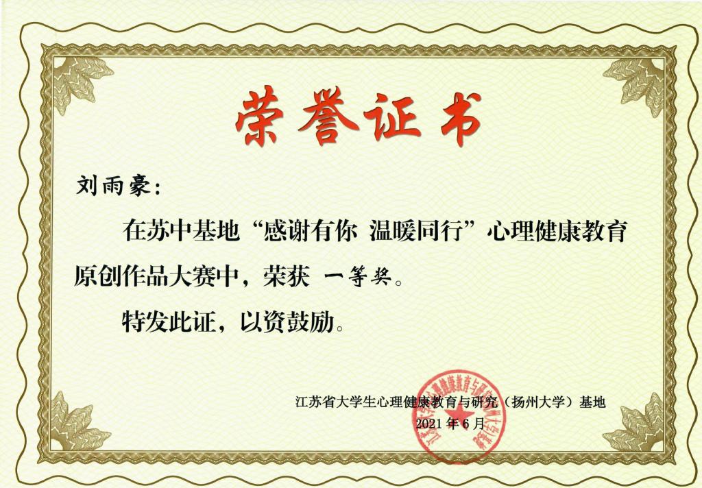 永利官网共报送作品四部,全部获奖。在心理征文类作品评选中,陈芸竹同学的作品《感恩那些炽热的爱》获得一等奖,葛倩倩同学的作品《梧桐未眠》获得二等奖。在原创作品评选中,刘雨豪同学创作的原创音乐《碎片》获得一等奖,徐璐同学创作的心理漫画《回“疫”》获得二等奖。