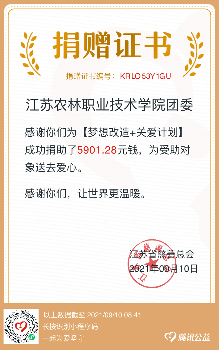 为推动党史学习教育“我为群众办实事” 实践活动走深走实,精准助力乡村振兴,促进教育事业发展,帮助全省“事实孤儿”、贫困大学生在内的困境青少年更好的健康成长,9月7日-9月9日,由共青团江苏省委、江苏省慈善总会、江苏省学生联合会、江苏省青少年发展基金会联合发起的“梦想改造关爱计划”助学项目“99公益日”网络募捐活动正式上线。