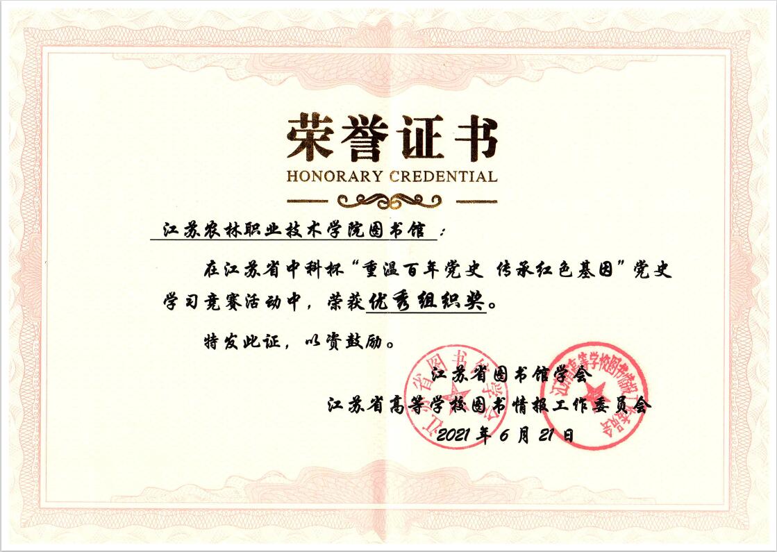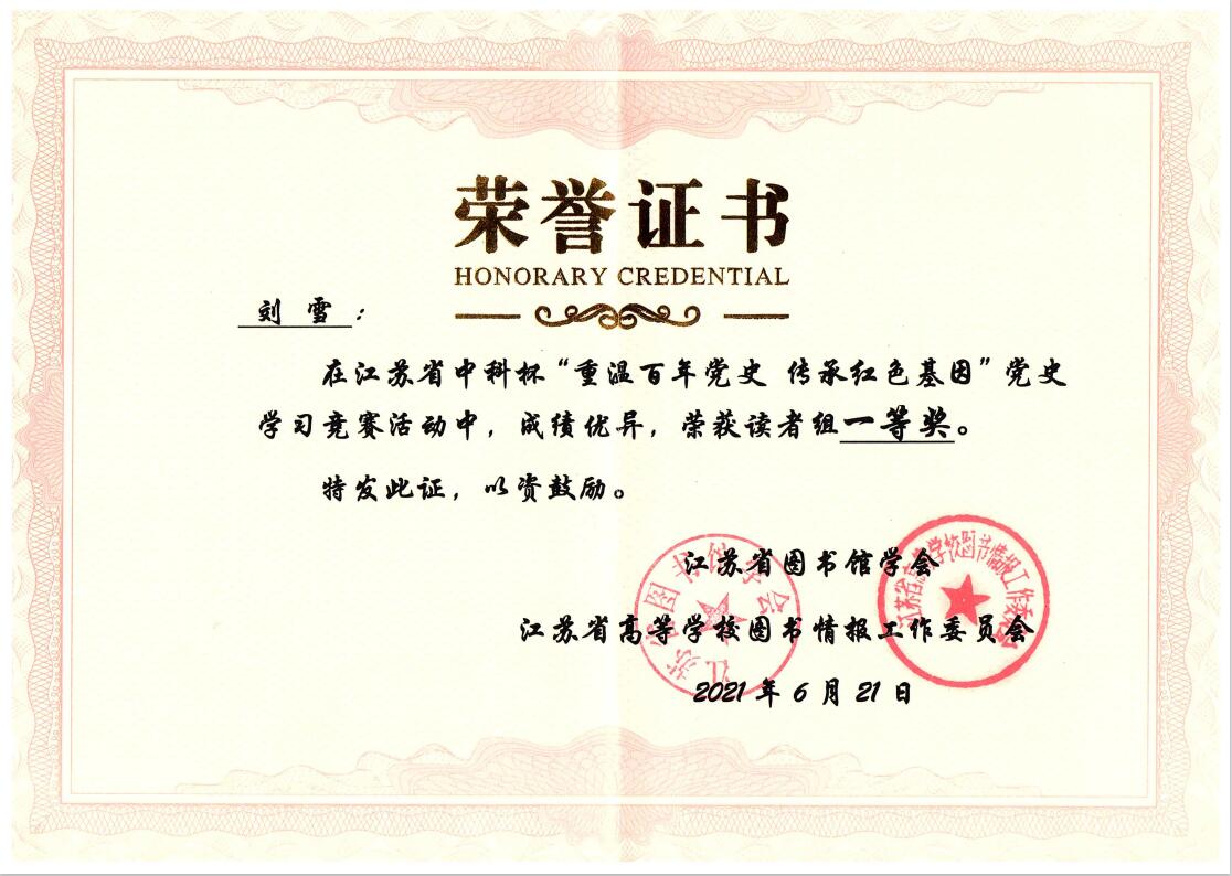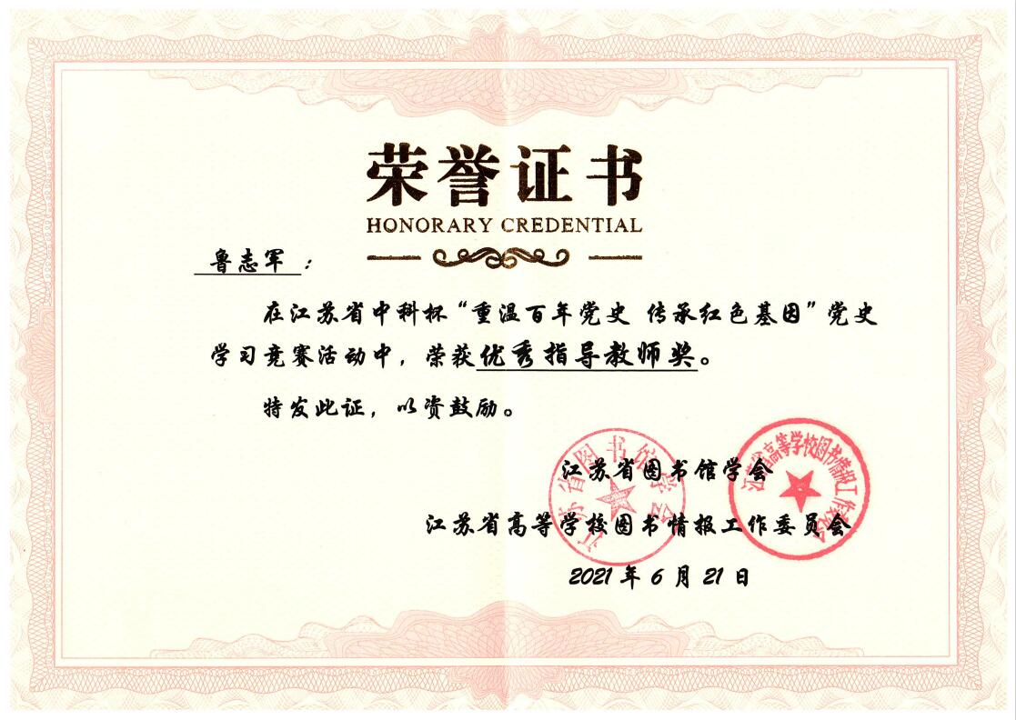 近日,江苏省中科杯“重温百年党史 传承红色基因”线上党史学习竞赛落下帷幕。本次竞赛由江苏省图书馆学会、江苏省高校图书情报工作委员会主办。来自全省96所图书馆的2.6万名读者参与角逐。我校图书馆在机电工程学院、经济与人文学院的大力支持下,联合团委精心组织全校近1千名师生读者参与竞赛,取得了1个一等奖、4个三等奖的优异成绩,我校图书馆鲁志军老师荣获“优秀指导教师奖”,我校图书馆荣获“优秀组织奖”。