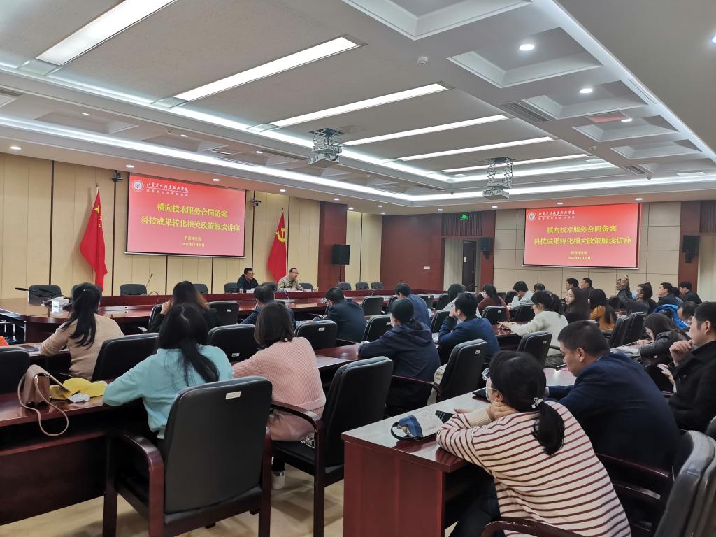 为提升永利官网教师科技成果转化和服务社会的能力,科技开发处邀请镇江市技术交易所曹宏兵所长于10月29日下午在学院九楼会议室进行“横向技术服务合同备案和科技成果转化相关政策解读”专题讲座。各二级学院分管科研负责人、近三年博士、主持市厅级以上项目负责人、创新团队负责人等六十多位老师参加。