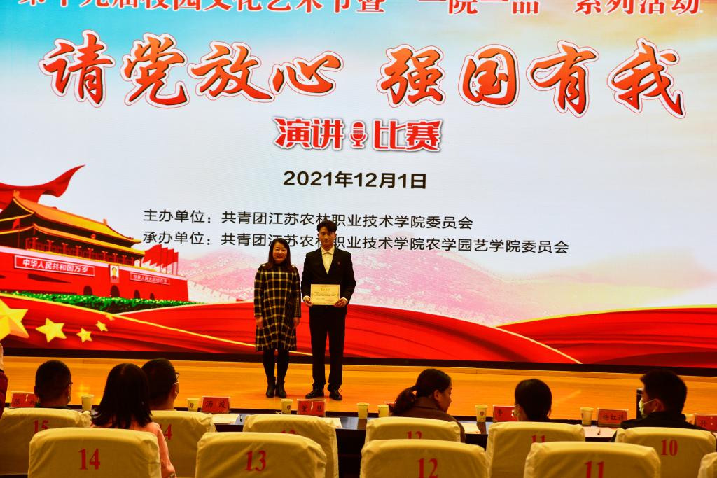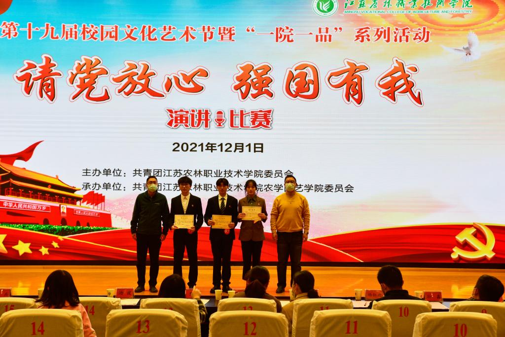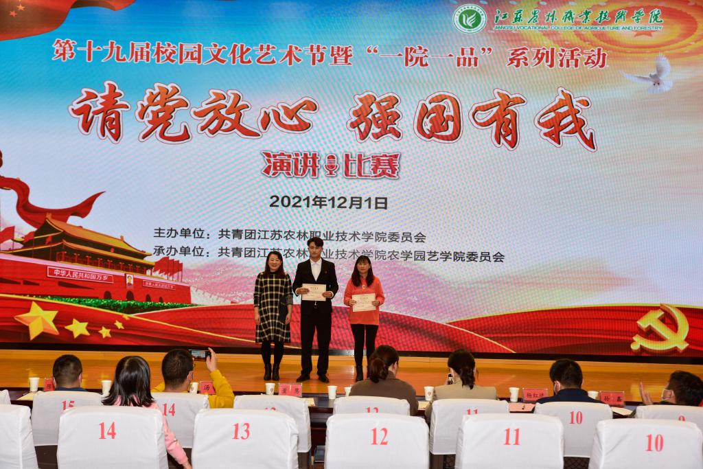 比赛中,16名参赛选手围绕“请党放心 强国有我”主题,结合自身学习、生活和成长经历等,谈体会、讲理想、树目标,一个个鲜活感人的事迹、一句句铿锵有力的誓言,展现了农林青年学子感党恩、听党话、跟党走的坚定信念。经过激烈的角逐,茅山校区张金川同学获一等奖,畜牧兽医学院王小凡、茅山校区范林立、畜牧兽医学院徐奥运等3位同学获二等奖,风景园林学院刘嘉祺、刘依童,经济与人文学院马爱兰,茶与食品科技学院徐魏、沙莎等5位同学获三等奖。农学园艺学院团委、茅山校区团委获优秀组织奖。