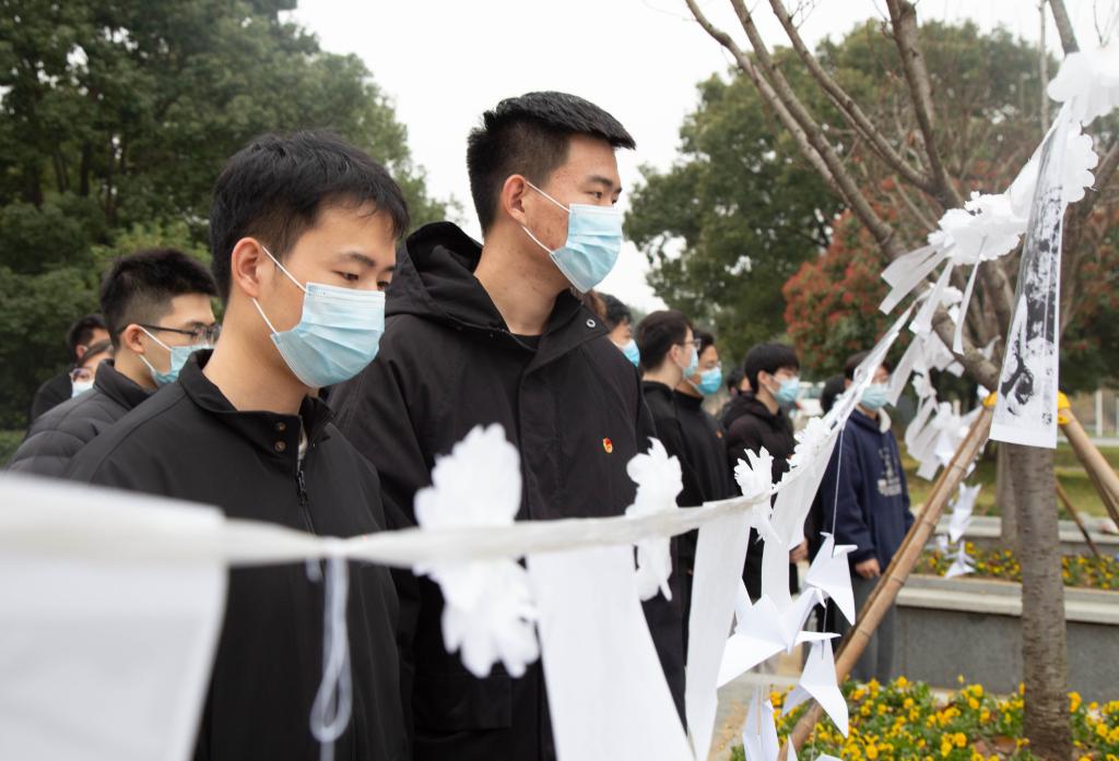 献白菊,折白鹤,寄哀思。随后,同学们为遇难同胞献上白菊,将哀思写在白纸上,折成千纸鹤,千纸鹤在树上随风摆动,寓意着同学们对遇难者的哀悼,对和平的呼唤。夜幕渐起,同学们用蜡烛摆成心形“12.13”的形状,默哀祈祷。