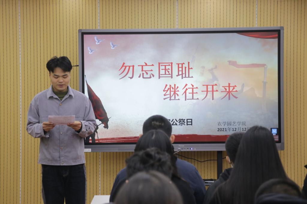 12月13日是第八个南京大屠杀死难者公祭日,为了缅怀惨遭日本侵略者杀戮的死难同胞,让同学们铭记历史,珍爱和平,增强爱国主义情感,2021年12月12日农学园艺学院在研发楼二楼会议室开展了“勿忘国耻,继往开来”国家公祭日主题教育活动。