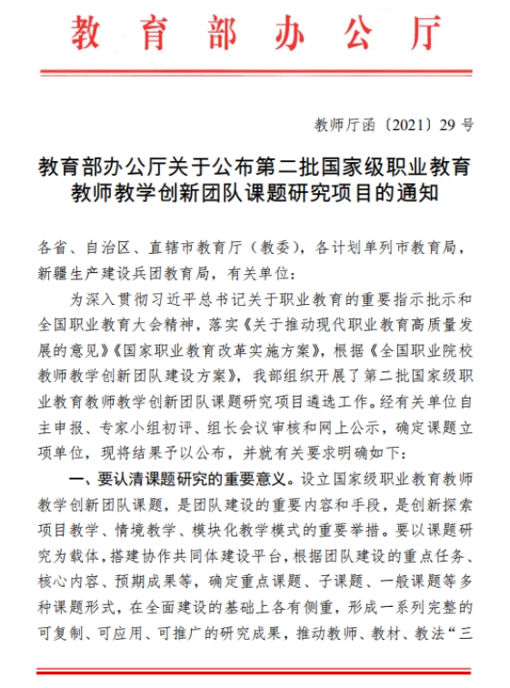 国家级职业教育教师教学创新团队课题研究项目遴选工作,由教育部按照《国家职业教育改革实施方案》工作部署,根据《全国职业院校教师教学创新团队建设方案》工作安排统筹推进,由国家级职教创新团队立项建设(培育)单位、全国重点建设职教师资培养培训基地、全国职业教育企业实践基地和有关院校单位自主申报,经专家评审和面向社会网上公示后最终确定。