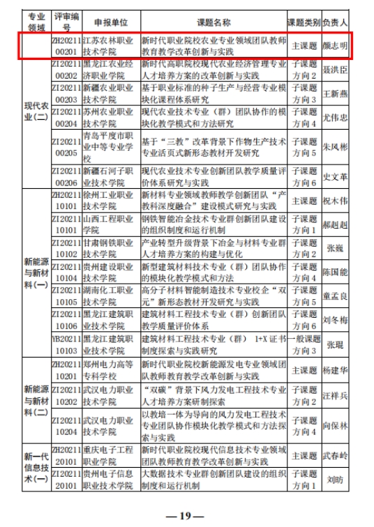 近日,教育部下发《关于公布第二批国家级职业教育教师教学创新团队课题研究项目的通知》,农学园艺学院院长颜志明负责的《新时代职业院校农业专业领域团队教师教育教学改革创新与实践》课题,获批教育部第二批国家级职教创新团队主课题研究项目立项。