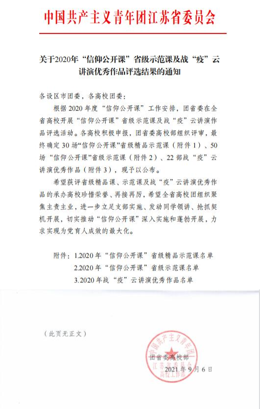 近日,共青团江苏省委公布了2020年全省高校“信仰公开课”省级示范课及战“疫”云讲演优秀作品评选结果,由永利官网团委推荐、唐智老师主讲的“信仰公开课·新思想公开课”之《坚定青春信仰共谱时代华章》在全省报送作品中脱颖而出,获评省级示范课。
