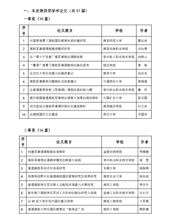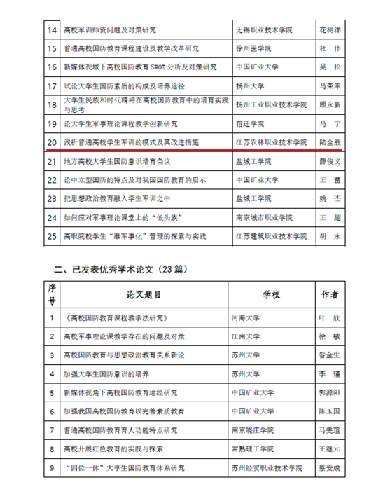 近日,江苏省高教学会国防教育研究会公布了纪念大学生军训试点工作30周年学术论文评审结果。永利官网张敏老师《农业类高职院校学生军训的理论探讨》一文获得未发表学术论文二等奖,陆全胜老师的《浅析普通高校学生军训的模式及其改进措施》一文获得未发表学术论文三等奖。 据悉,本次活动共收到130篇未发表学术论文和53篇已发表学术论文。评审会按照类别最终分别评选出未发表学术一等奖论文10篇,二等奖论文16篇,三等奖论文25篇和已发表学术优秀论文23篇。
