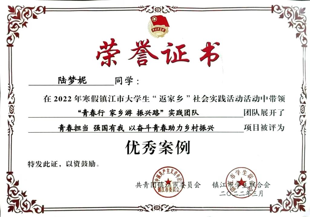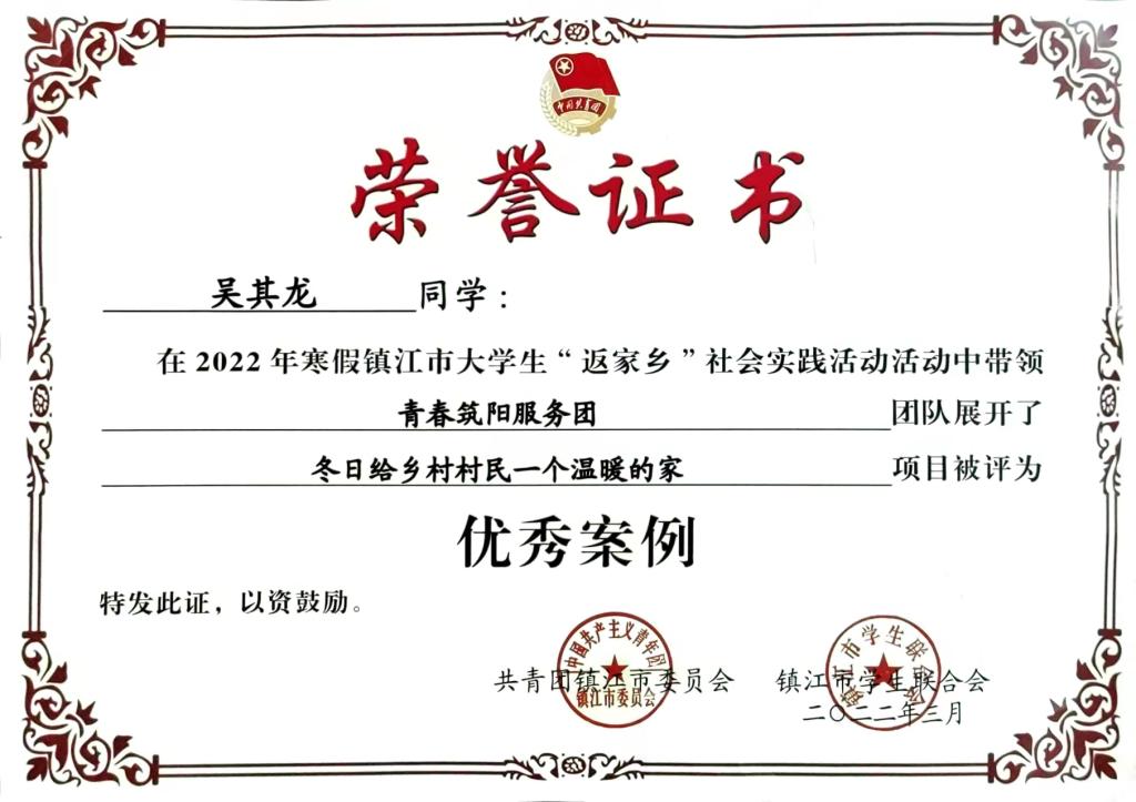 近日,共青团镇江市委员会、镇江市学生联合会公布了2022年寒假镇江市大学生“返家乡”社会实践活动优秀案例名单,永利官网青心筑梦实践团开展的“践行初心使命 助力乡村发展”实践、闪闪红星实践团开展的“感受红色情怀追忆革命精神”实践、青春筑阳服务团开展的“冬日给乡村村民一个温暖的家”实践、“青春行 家乡游 振兴路”实践团队开展的“青春担当 强国有我 以奋斗青春助力乡村振兴”实践等4项目获评2022年寒假镇江市大学生“返家乡”社会实践活动优秀案例。