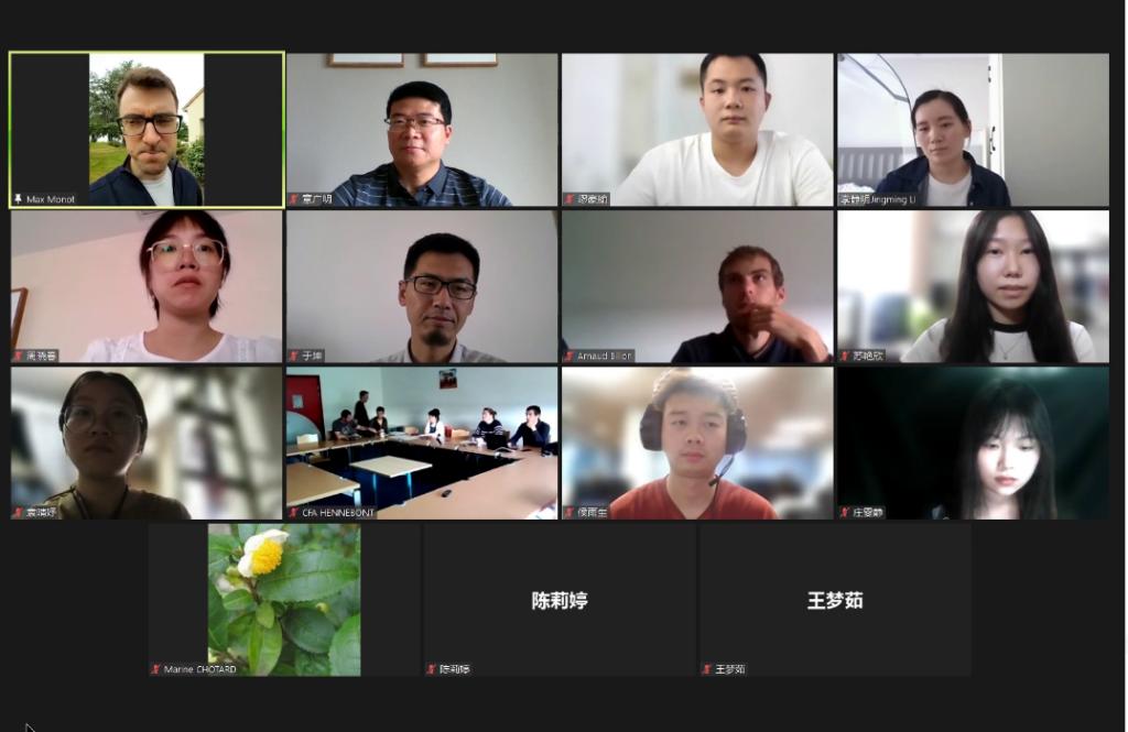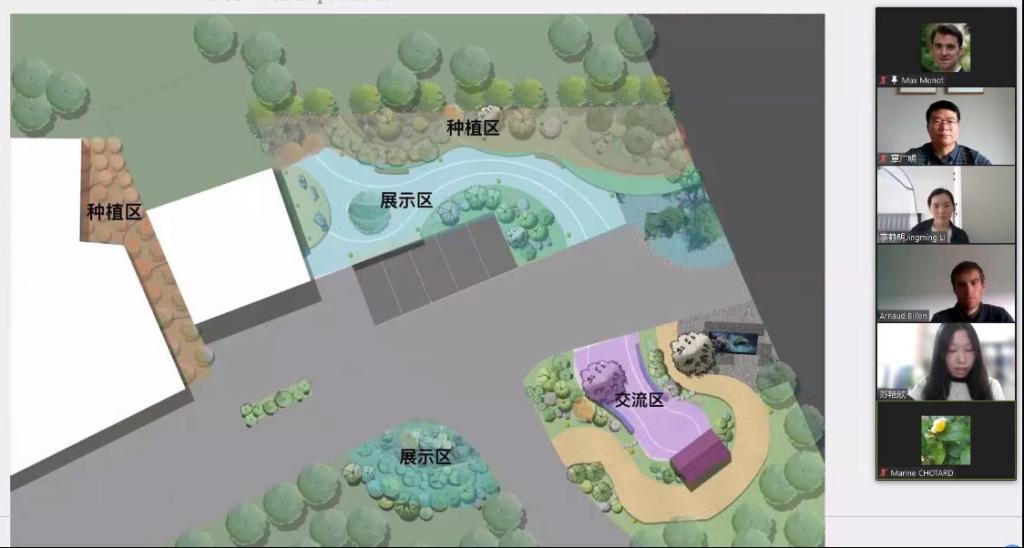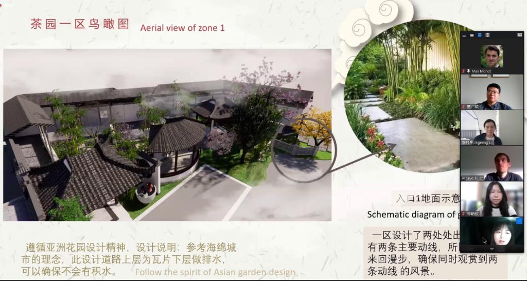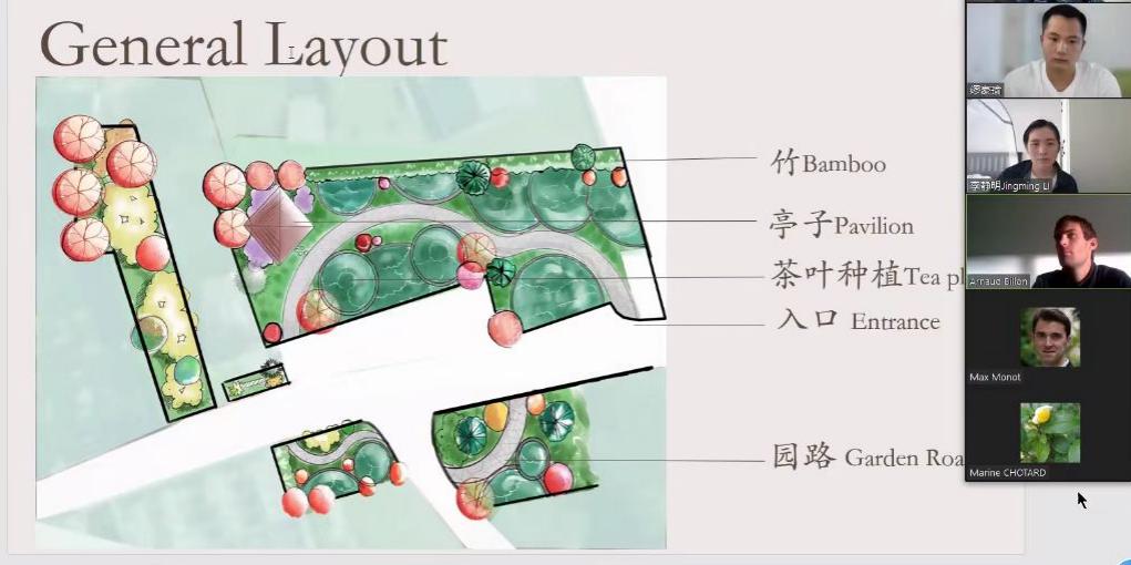 近日,艾内邦中法友谊园设计比赛的决赛以线上汇报的形式开展,法国农业部中法农业教育合作主任马克斯、艾内邦农业学校农场总经理Arnaud Billon、艾内邦农业学校茶业项目经理Marine Chotard、永利官网章广明、于坤、周晓春老师、国际教育学院李静明老师以及双方参赛学生等,参加了此次线上比赛汇报会(图1)。