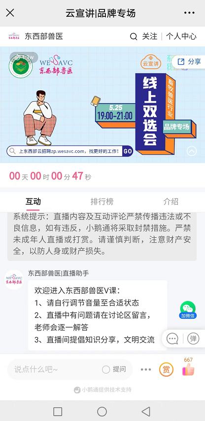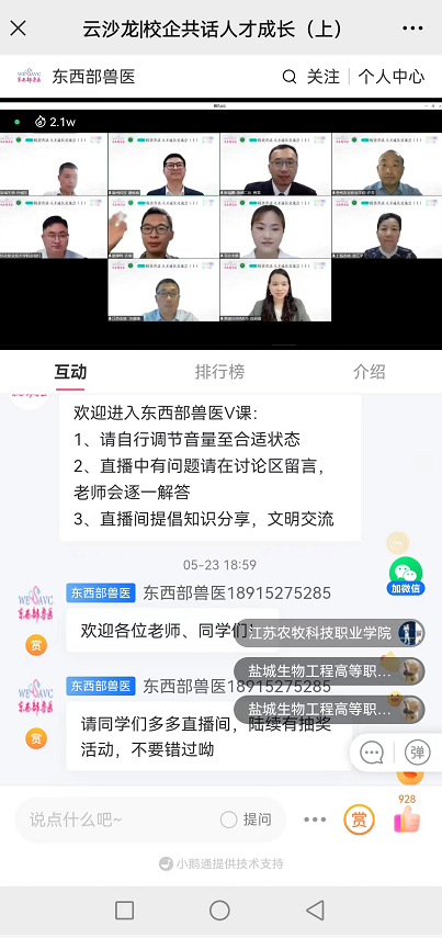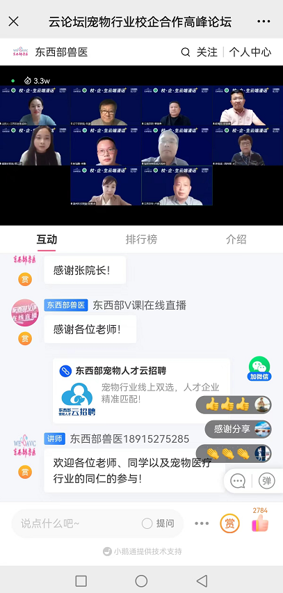 5月26日,在中国现代农业职业教育集团的指导下,由我校与东西部兽医和中农产教(北京)科技有限公司联合主办、畜牧兽医学院承办的“校·企·生云端漫话”系列活动圆满收官。该系列活动自5月22日拉开序幕,由一场“云论坛-宠物行业校企合作高峰论坛”、两场“云沙龙-校企共话人才成长”、两场“云招聘-企业专场宣讲会”共五场活动组成,此次活动得到了50多家院校师生的广泛关注,直播间访客数超10000人,直播间浏览量超30000次,最热烈的一场活动热度超过30万。