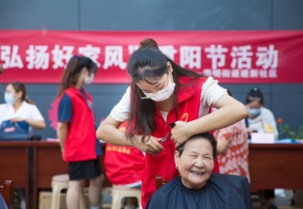 活动在歌曲《歌唱祖国》中拉开序幕,傣族舞《灵》、朗诵《王二小的故事》等节目轮番上场。畜牧兽医学院的表演者载歌载舞,现场气氛热情欢乐。大家兴高采烈地挥动手中的国旗,一起合唱《我爱你中国》共祝祖国繁荣美好,祝愿老人健康长寿、幸福永远。学院义剪志愿者们准备好凳子、各种理发工具,热情地为老人们免费理发。志愿者们耐心地与老人进行沟通,细心认真地为老人修剪出满意的发型。
