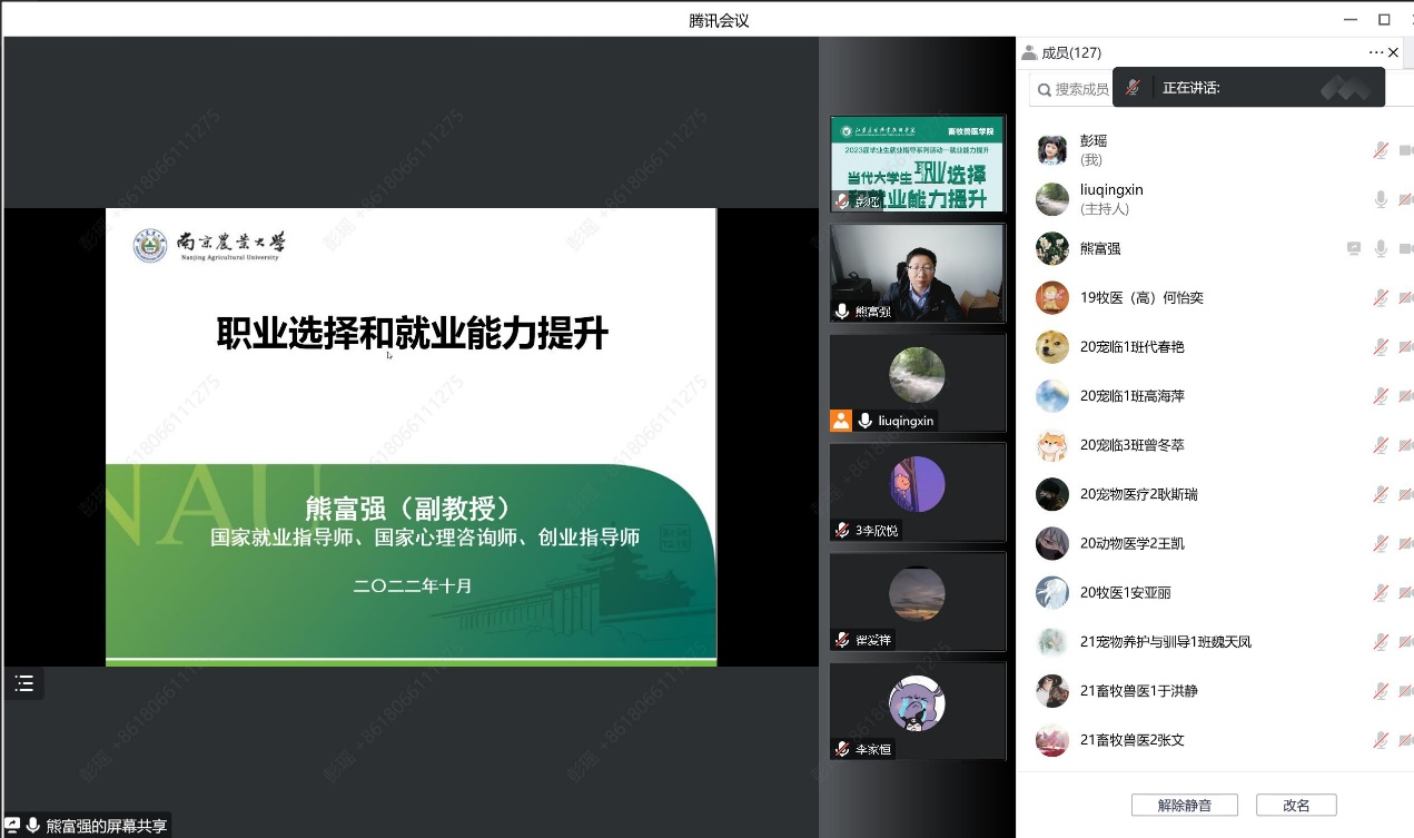 10月8日,畜牧兽医学院组织开展了“当代大学生职业选择和就业能力提升”主题线上讲座,邀请了南京农业大学组织部副部长熊富强主讲,200余名学生参加了讲座。