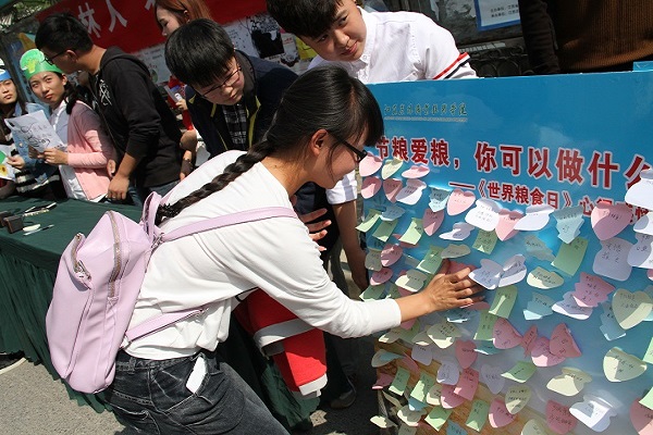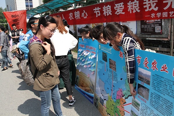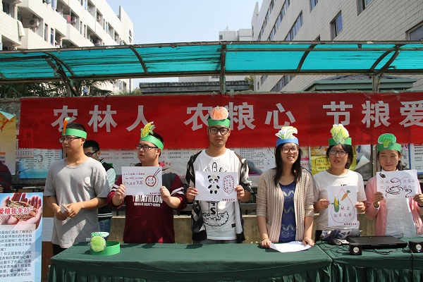 10月16日是世界第35个粮食日,为了提倡同学们节约和爱惜粮食、拒绝浪费,养成良好的节俭习惯。近日,农学园艺系在食堂门口举行了“农林人,农粮心,节粮爱粮我先行”倡议活动。 活动现场,同学们结合自己的专业知识,制作了中国各省农业自然灾害分布图,并给到场的同学们讲解,感召大家节约粮食,爱护环境;志愿者们头戴粮食图案类型的帽子,手举节粮爱粮的绘画图案,倡议大家从一日三餐做起,节约粮食;到场的同学们纷纷在“节粮爱粮,你可以做什么?——《粮食日》心得感悟墙”的倡议展板前面驻足,写下了自己的感悟并贴于板子上;志愿者们还给过路的同学们分发了节粮小知识的的宣传便签。 通过此次活动的开展,让同学们用专业知识来倡议节约,让“珍惜粮食,从我做起”的理念在校园发扬,为建设节约型校园做出贡献。