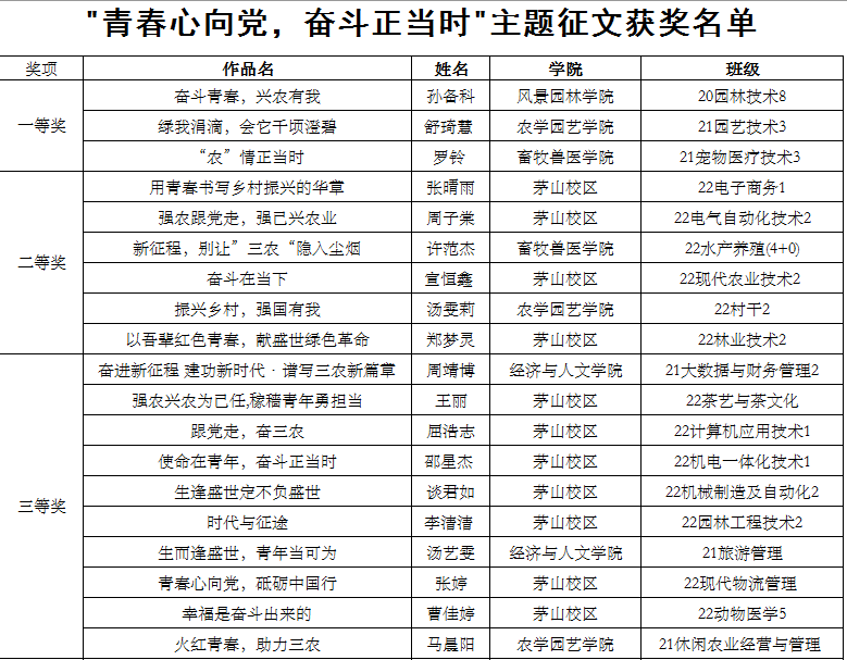 此次征文活动面向学院全体学生,同学们踊跃投稿,以优美文字讴歌新时代发展的伟大成就,抒发对党和祖国的热爱,提倡以强农兴农为己任,筑牢三农情怀。活动共收到征文作品300余篇,通过初审、复审、终审等环节,最终评选出一等奖3名,二等奖6名,三等奖12名。