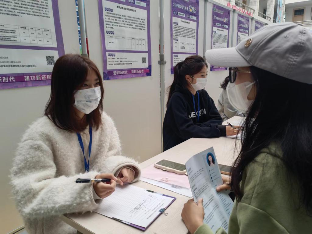 本次招聘会吸引了京东集团、永辉超市、顺丰、华侨城集团、南京欢乐谷等40家参会单位,提供财务类、营销类、管理类、电商类等岗位2700余个。现场由40余名优秀志愿者承担了各用人单位的招聘任务,全体毕业生积极参与,共收集纸质及电子简历1500余份,取得了良好的现场交流效果。