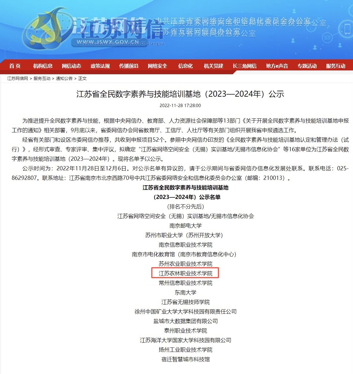 为推进提升全民数字素养与技能,根据中央网信办、教育部、人力资源社会保障部等13部门《关于开展全民数字素养与技能培训基地申报工作的通知》相关部署,由信息工程学院牵头提交的《数字新农人》项目脱颖而出,2022年12月永利官网成功入选江苏省全民数字素养与技能培训基地。