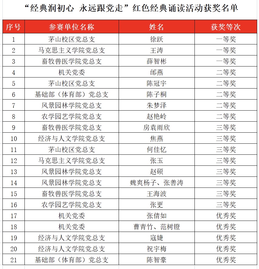 本次活动分为初赛和决赛,各部门经初赛评选后提交2-3篇作品参加录制进行决赛。经专家评审,茅山校区党总支徐跃、马克思主义学院党总支王涛、畜牧兽医学院党总支薛智彬等三位师生获得一等奖。