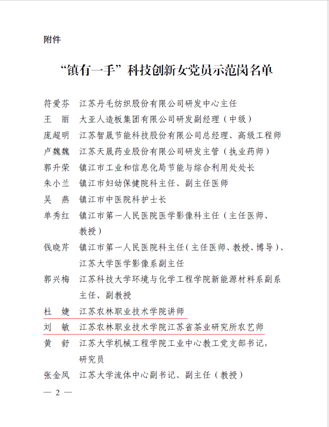 为更好地发挥女党员在推动高质量发展、创造高品质生活、实现高效能治理中贡献巾帼科技力量,充分发挥典型的示范带动作用,激励引领广大城乡妇女岗位建功创新业,镇江市妇联在全市开展了“镇有一手”科技创新女党员示范岗推荐申报活动,经申报、考评、公示等环节,茶与食品科技学院刘敏和畜牧兽医学院杜婕获评“镇有一手”科技创新女党员示范岗。