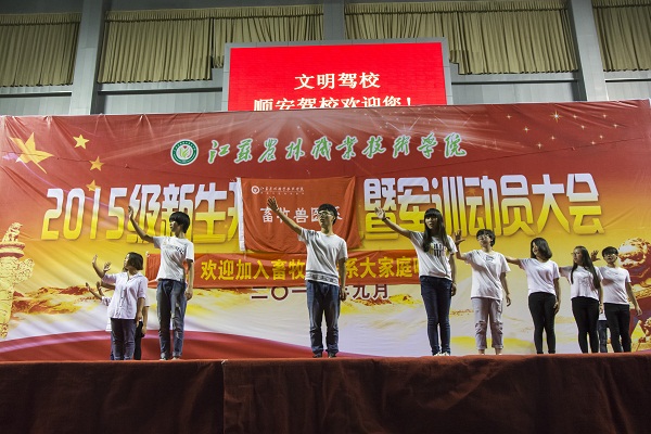 为丰富2015级新生军训生活,展现大学生青春活力,9月24日晚,畜牧兽医系分团委在体育馆二楼举办了新生慰问演出活动。 活动在歌曲《一起摇摆》中拉开帷幕,小品、手语操、街舞等精彩节目一个接一个上演,现场掌声不断。活动中,新生们还和老生互相pk歌舞,高潮迭起。这不仅展现了畜牧兽医系学子健康向上的精神风貌,也为军训中的2015级新生们带去欢乐和感动。