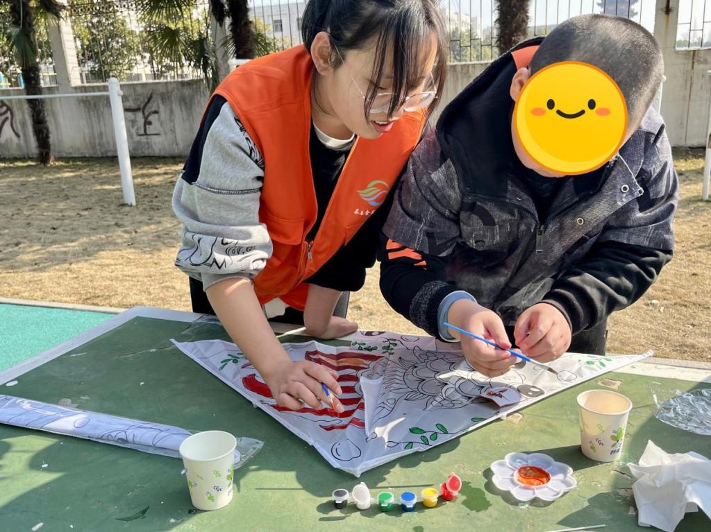 活动中,志愿者开展了剪纸、手绘风筝diy等活动。教室里同学们引导着小朋友们拿起剪纸,通过折叠变换、图形剪凑,形成有千纸鹤、小爱心、蜻蜓等形态各异的剪纸。在室外,同学们通过色彩调配、引导示范等多种方式帮助小朋友完成风筝绘制。小朋友们玩得不亦乐乎。